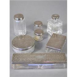 Seven Victorian silver mounted dressing table boxes and bottles, London 1871, maker W.N., (A/F) E...