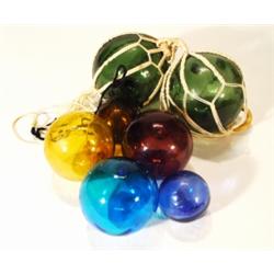 Seven assorted glass witches balls in greens, purples, blues and amber, largest 14cm diameter