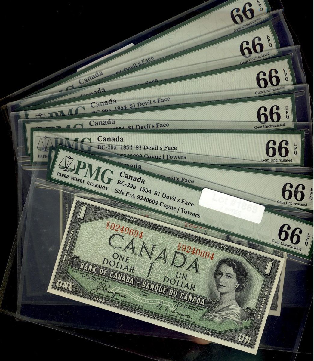 Seven consecutive notes of BC-29a 1954 $1 Devil's face Coyne-Towers S/N E/A9240694 to 700 both PMG UNC66 EPQ