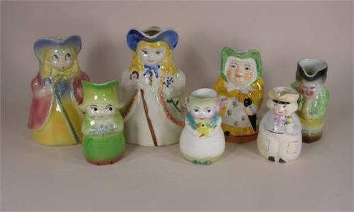 Seven figural pitchers including Shawnee, German, English and one Bo-Peep . Good Cond.