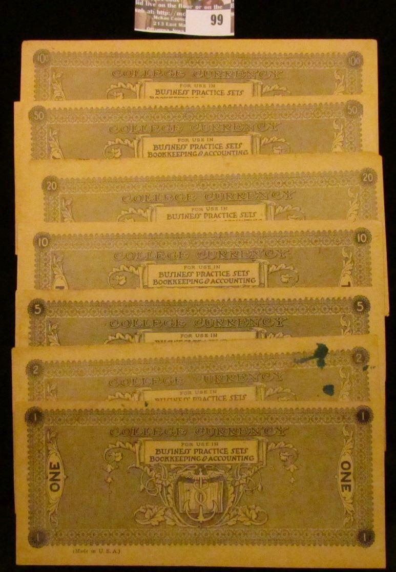 Seven-piece Set of "College Currency For Use in Business Practice Sets Bookkeeping & Accounting", includes $1, $2, $5, $10, $20, $50, & $100.00 notes. All Uncirculated.