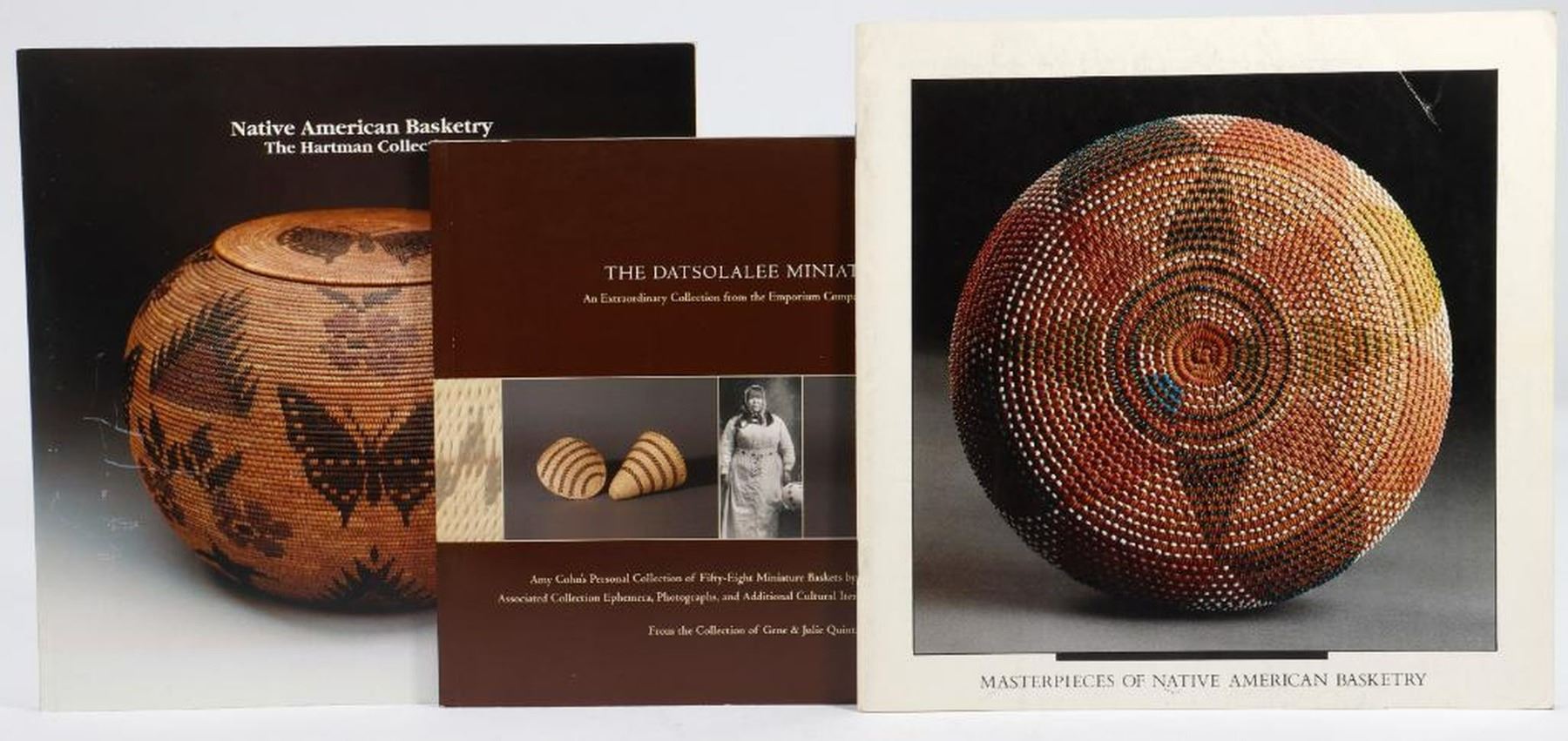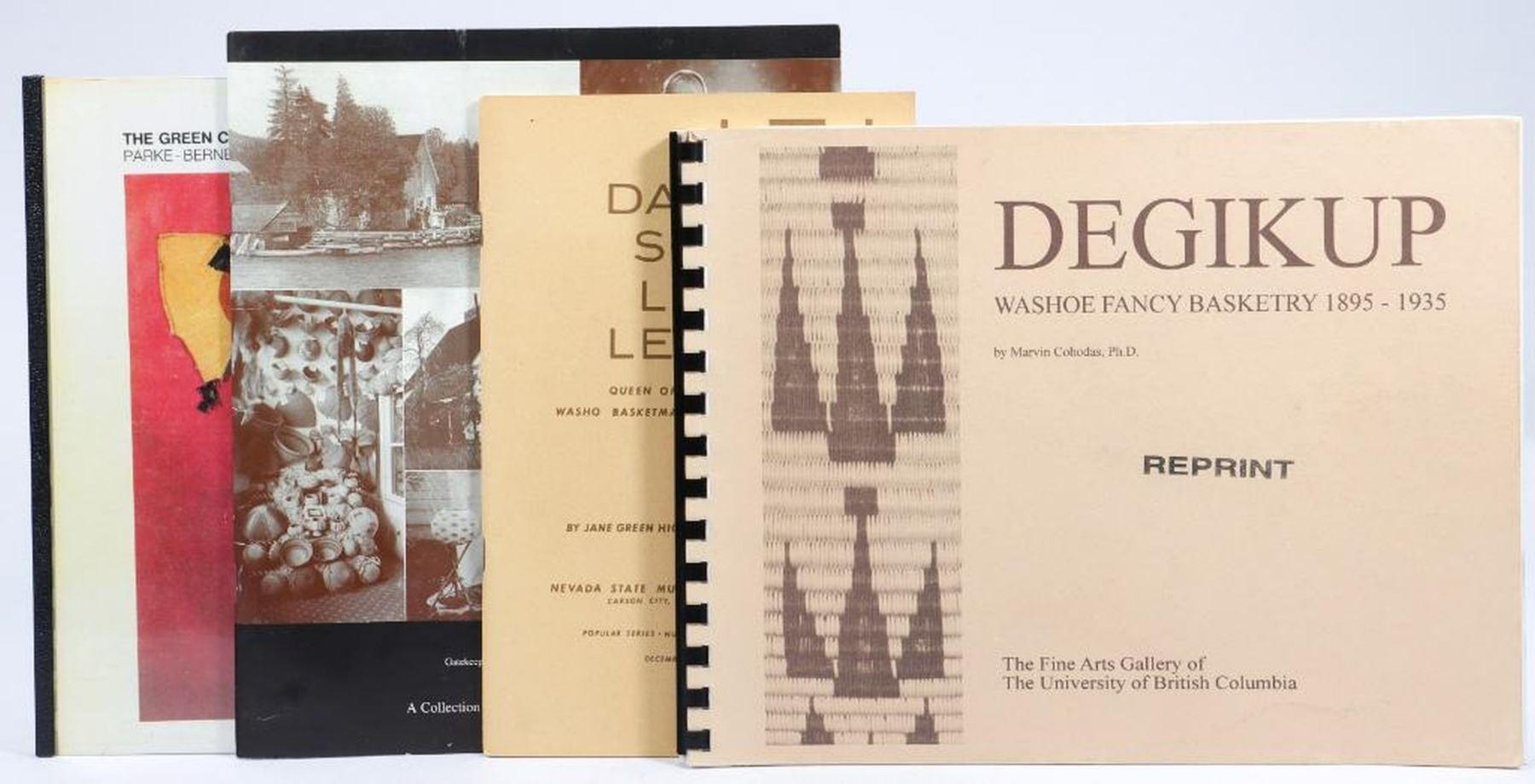 Seven publications on the weaving of Dat-so-la-lee and other exceptional basketry. 1.) BIBBY, BRIAN, et al. The Datsolalee Miniatures, an Extraordinary Collection from the Emporium Company, 1900-1921; Amy Cohn's Personal Collection of Fifty-Eight Miniature Baskets by Louisa Keyser (Datsolalee)... Carmichael: Gene and Julie Quintana, 2010. 2.) GIVENS, STEFANIE A., and SARA LARSON. Woven Legacy: A Collection of Dat-so-la-lee Works, 1900-1921. North Lake Tahoe Historical Society, 2005. 3.) HICKSON, JANE GREEN. Dat So La Lee, Queen of the Washo Basketmakers. Carson City: Nevada State Museum, 1967. 4.) PANHANDLE-PLAINS HISTORICAL MUSEUM. Masterpieces of Native American Basketry. June 15th to August 3rd, 1986. Exhibit catalog. 5.) SPENCER, MARK J. Native American Basketry, The Hartman Collection. Albrecht-Kemper Museum of Art, January 11-March 31, 1996. Photocopies: 6.) COHODAS, MARVIN. Degikup, Washoe Fancy Basketry, 1895-1935. Fine Arts Gallery of British Columbia, 1979. Spiral-bound photocopy of exhibit catalog. 7.) PARKE-BERNET GALLERIES. The Green Collection of America Indian Art. New York, November 19, 1971. Photocopy of sale catalog. Condition: Fair-Very Good; the volumes are from a well-used research library; some light toning.