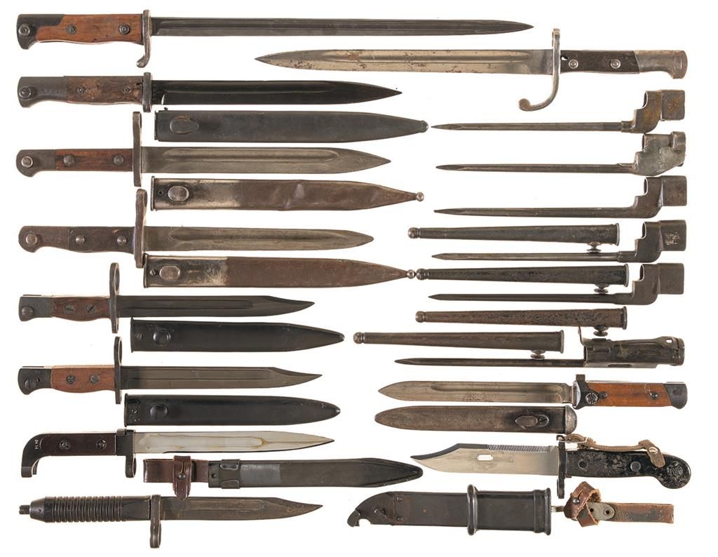 5 British Enfield Number 4 Mark II spike bayonets, 2 Enfield "jungle carbine" knife bayonets, one "ersatz" spike bayonet (likely French), 5 Mauser-style bayonets (including contract models), one HK 93 bayonet, 2 AK/AKM bayonets, and one Italian folding bayonet. All are fair or better overall.