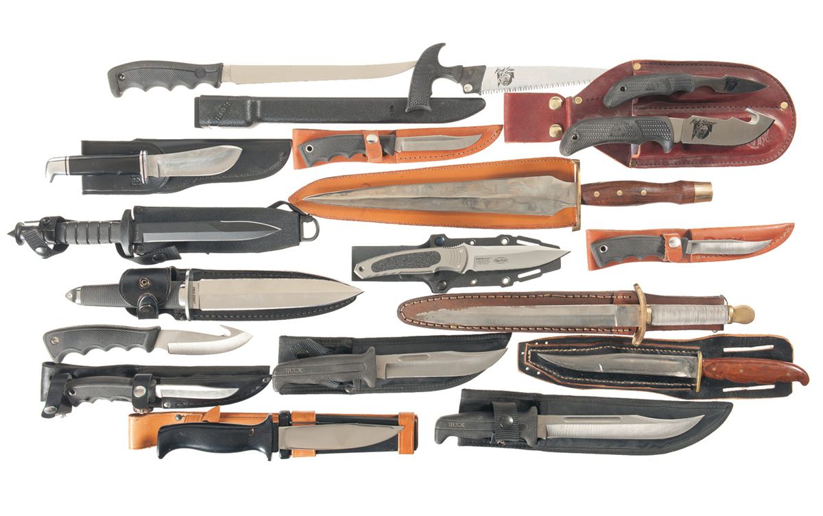 Includes 4 Buck knives, an Outdoor Edge 3-blade set, 2 Western+ Rack knives, 2 Buckmasters, Cold Steel Tai-Pan dagger, Ontario Spec Plus knife, Colt M4K knife and 4 other knives.