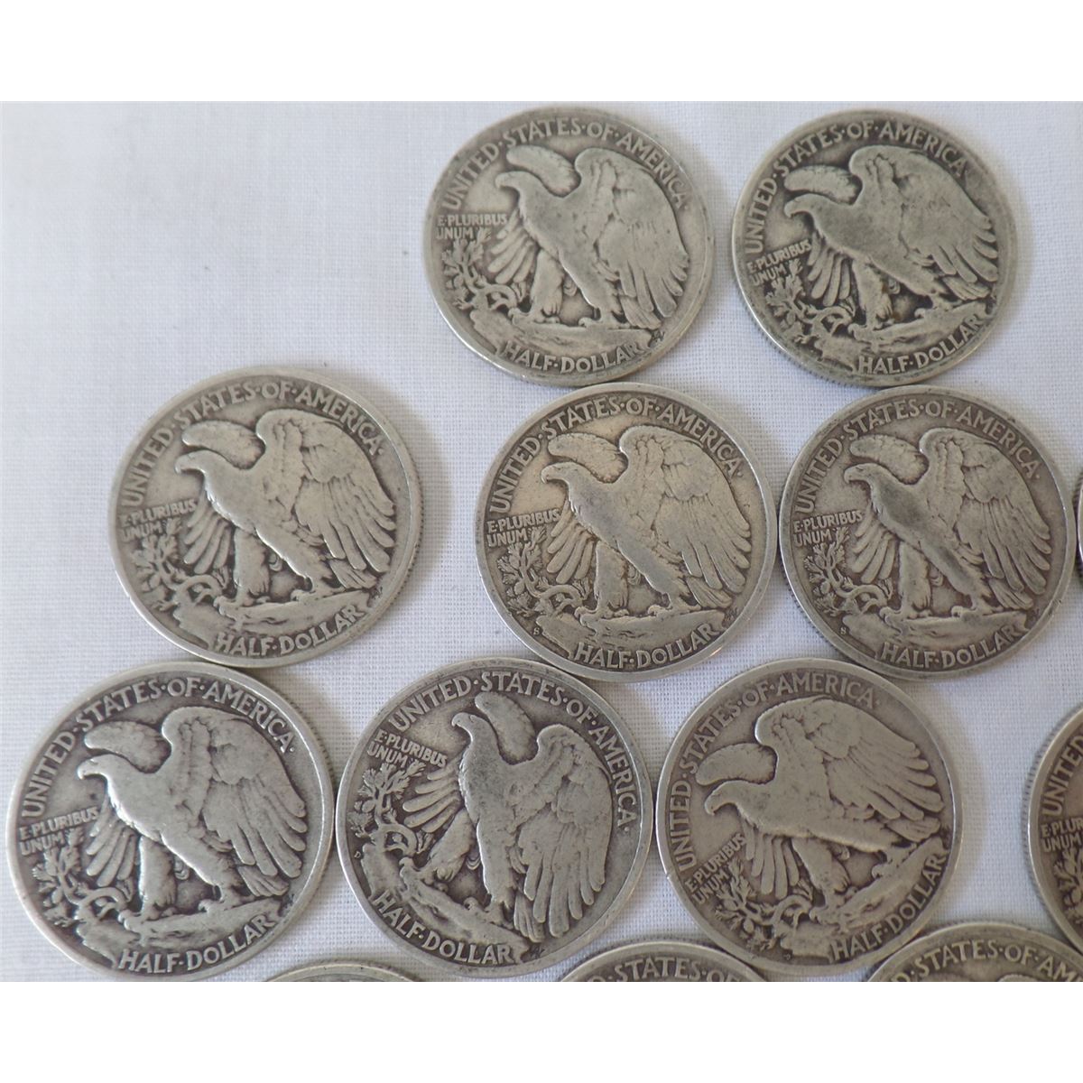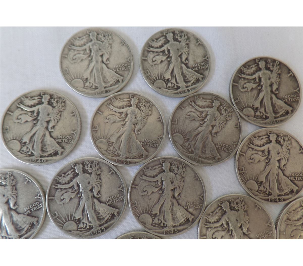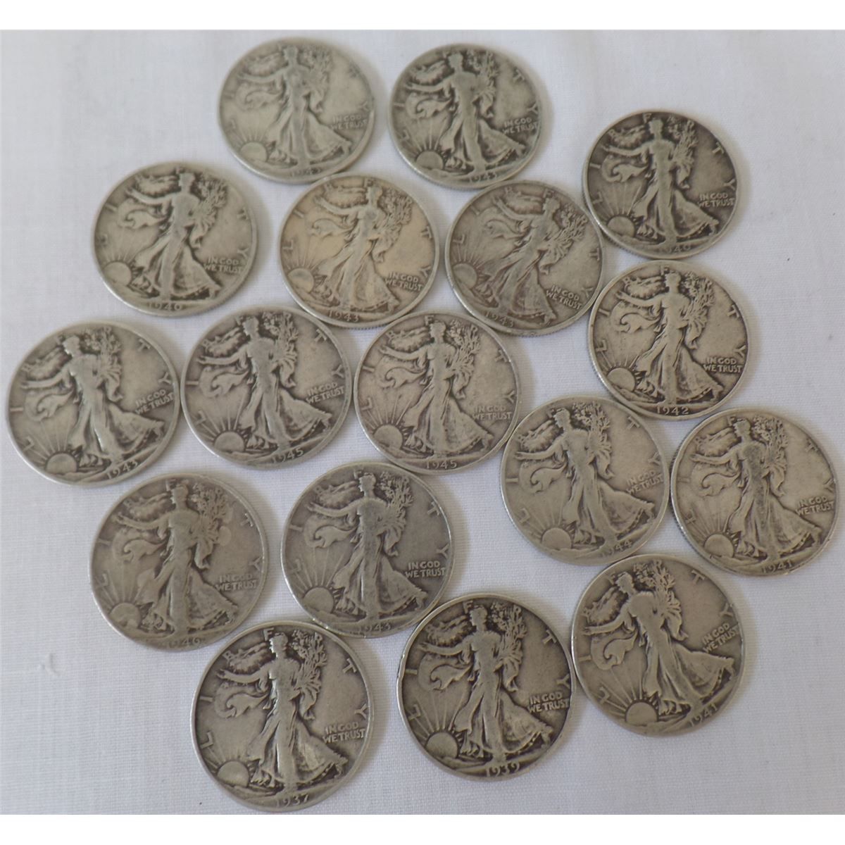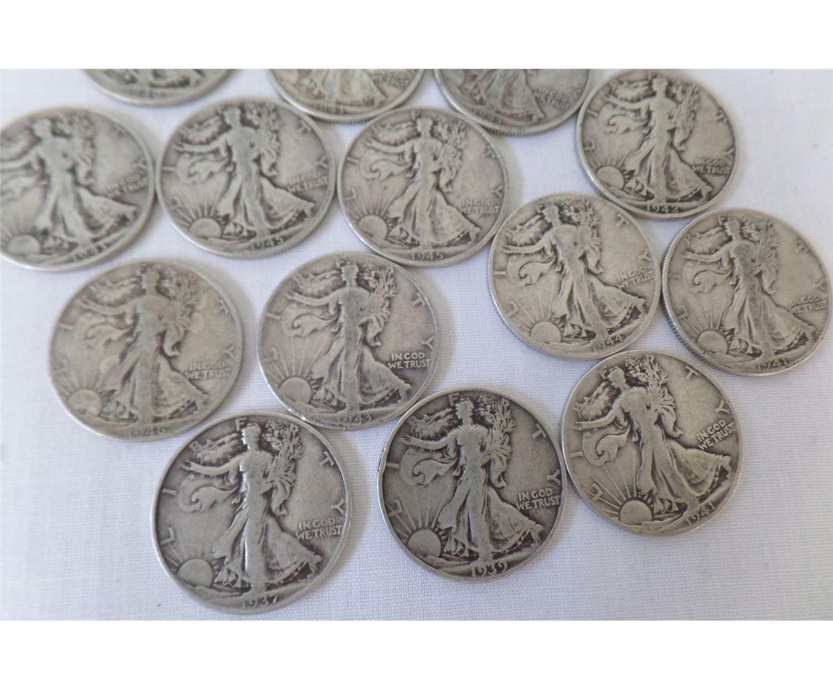 17 Walking Liberty Half Dollars dated from 1930 through 1940's. Made of silver. There are 17 each. Condition: Most have been circulated. Shipping $14.50