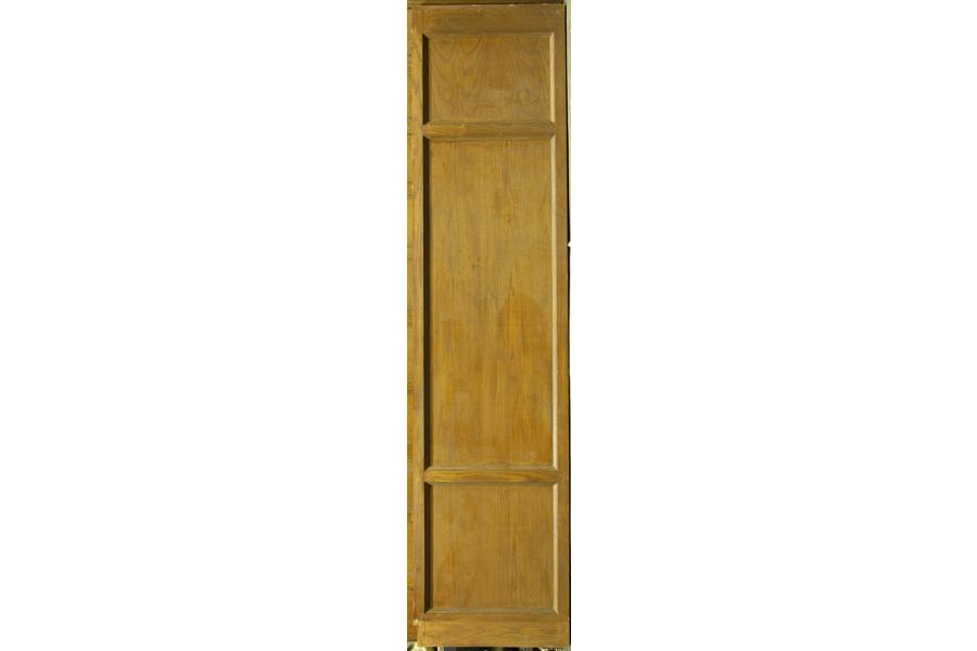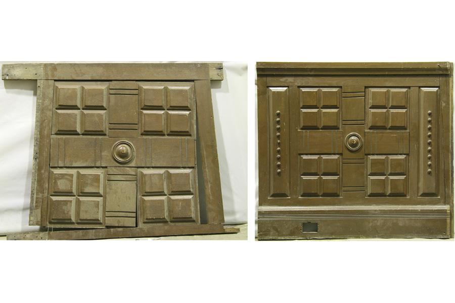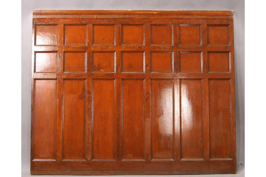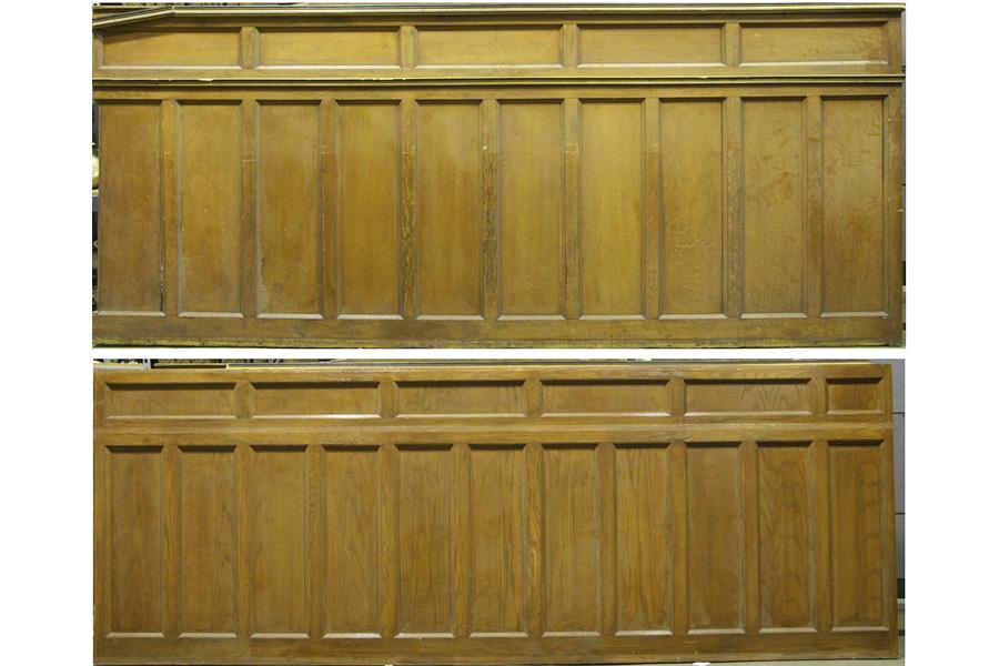 Seventeen pieces of oak and mahogany panels/wainscoting circa 1900. Consisting of six - triple stack oak, 25' running feet, 60" tall. Two gothic style mahogany, 5' running feet, 42" tall. Five gothic style oak, 16' running feet, 39" tall. Two oak with gilded band, 18' running feet, 50" tall. Two tall oak panels, each measuring 114" tall 27" wide.