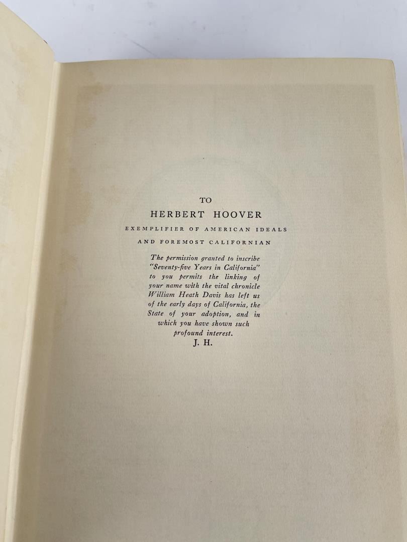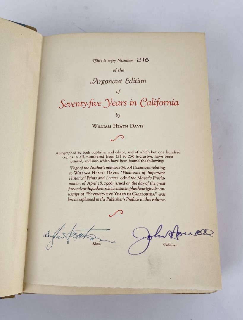 William Heath Davis John Howell This is copy number 216 of the Argonaut Edition. Signed by editor and publisher. Copyright 1929. Includes a manuscript page from the book and an original document relating to William Heath Davis