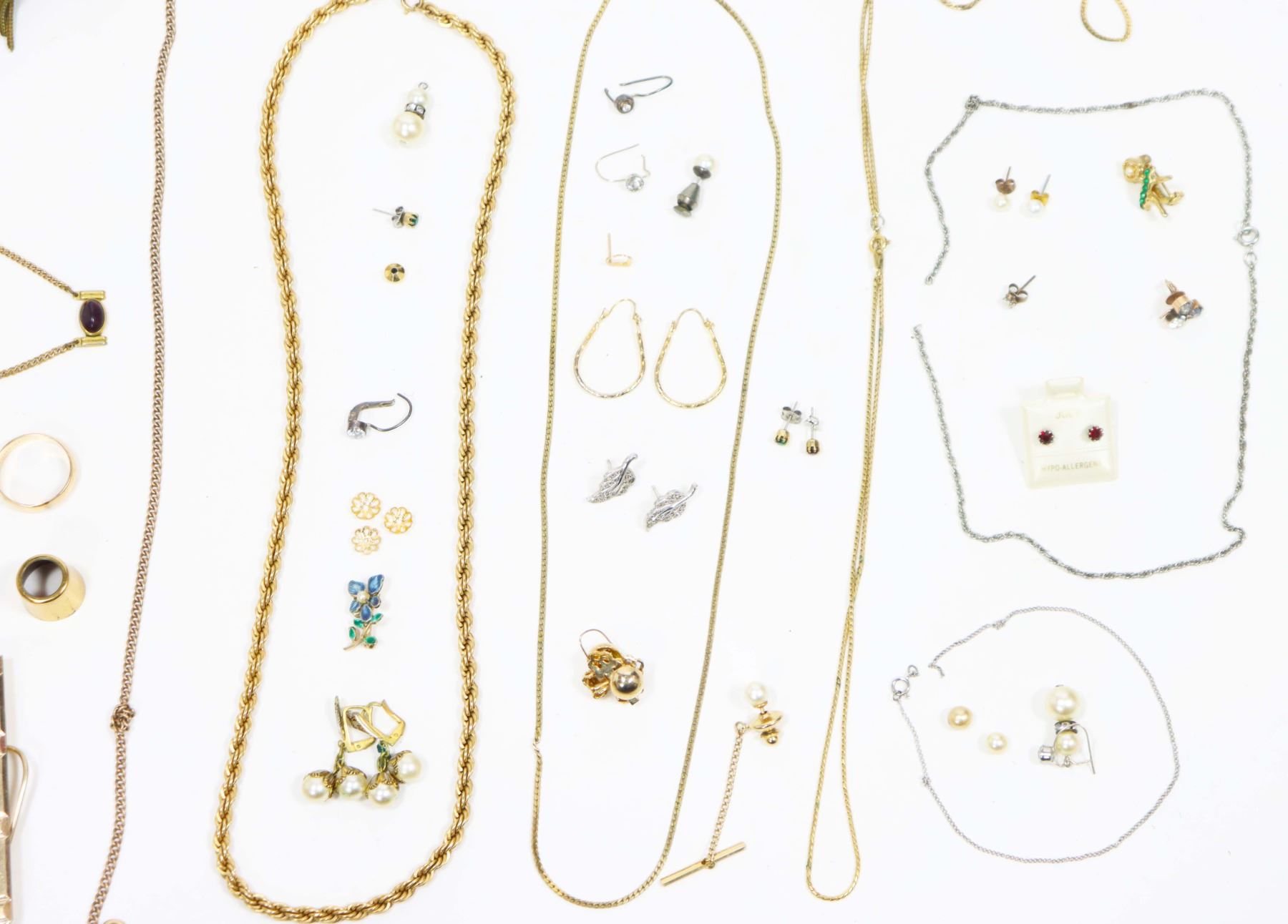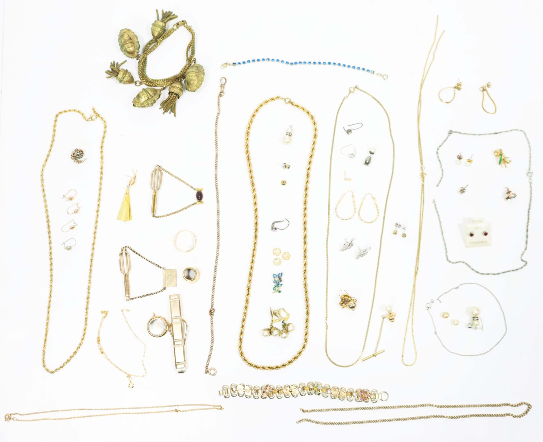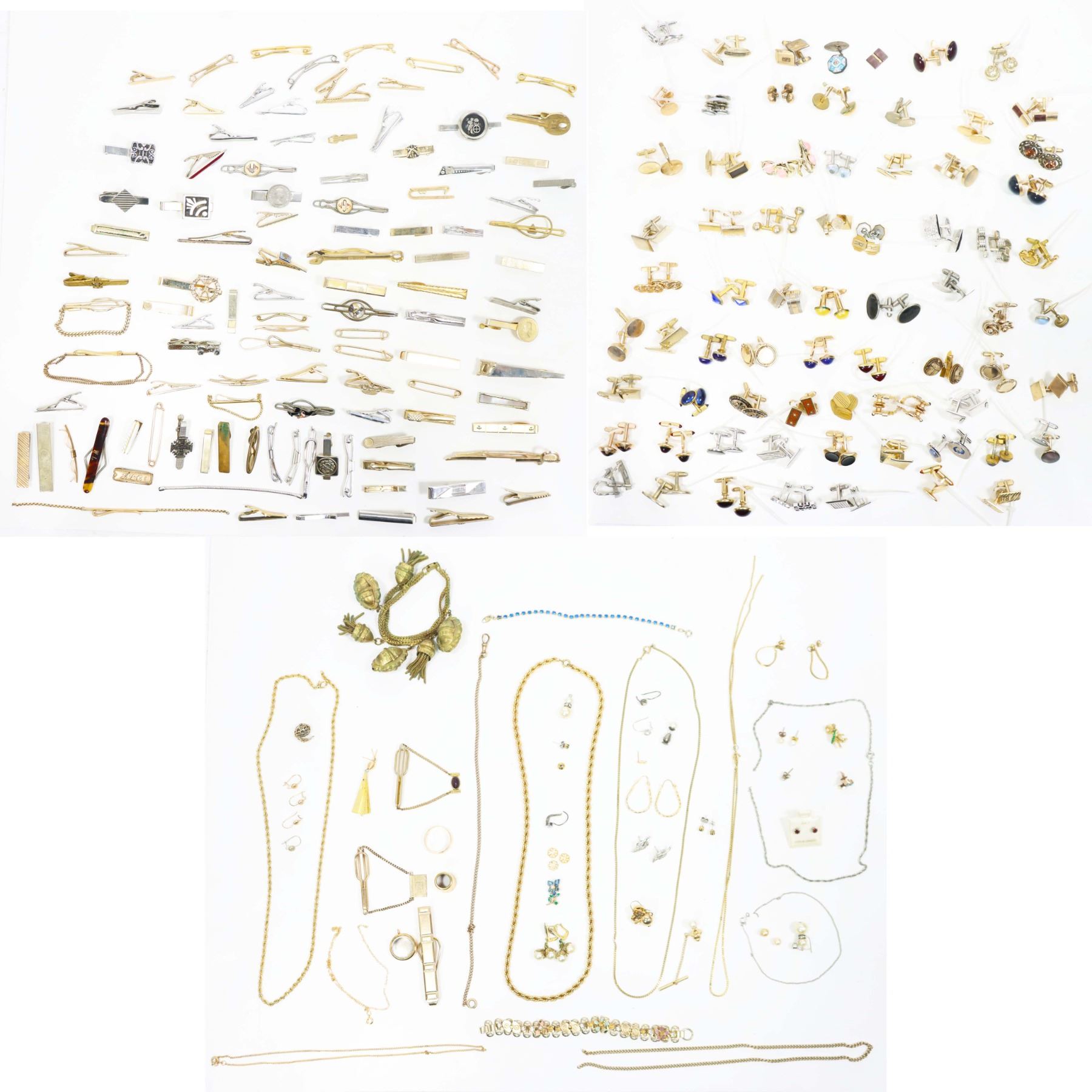 150+ lot of miscellaneous jewelry and other costume items, including necklaces, bracelets, tie clips, earrings, pins, and more! A treasure trove of fabulous vintage items waiting to be explored!