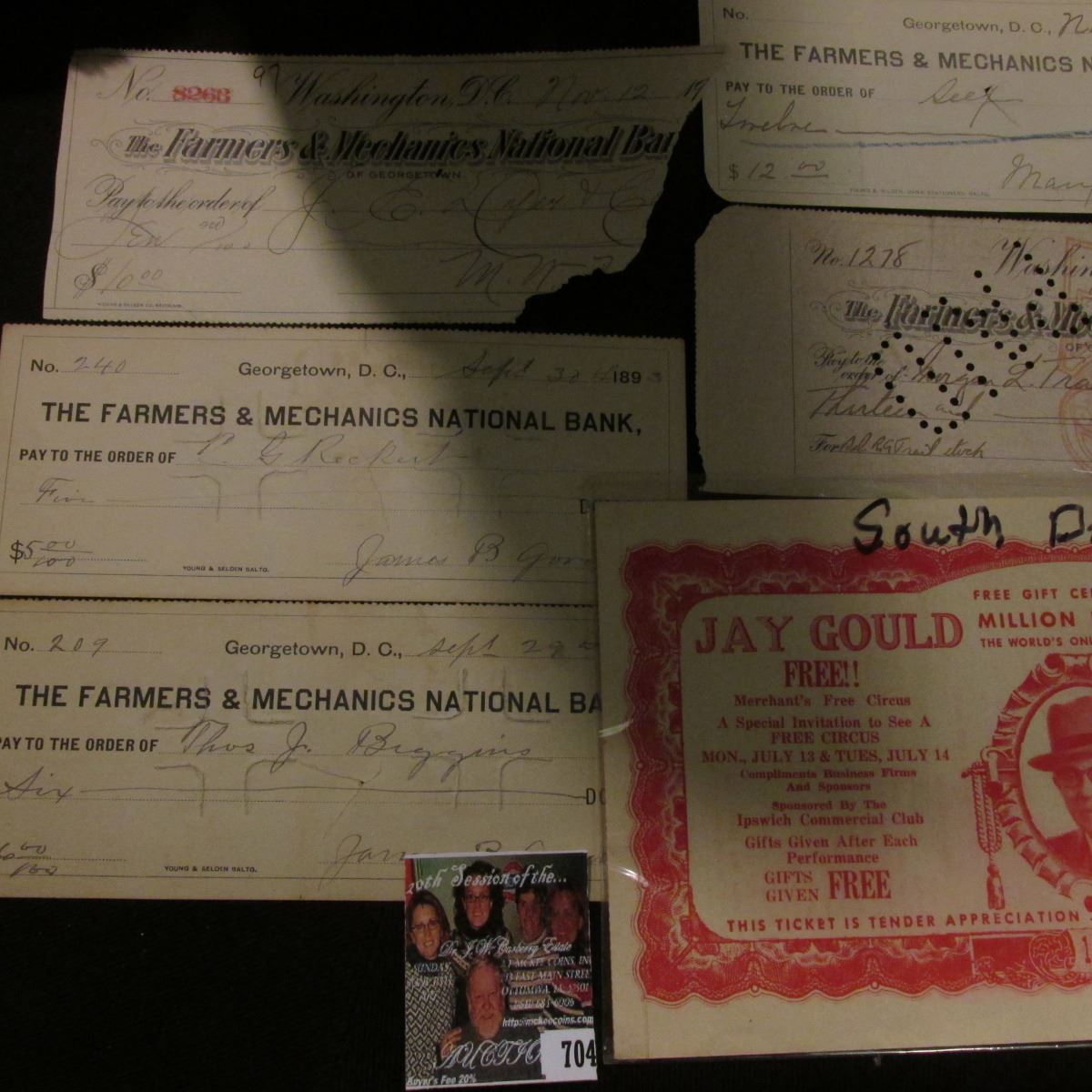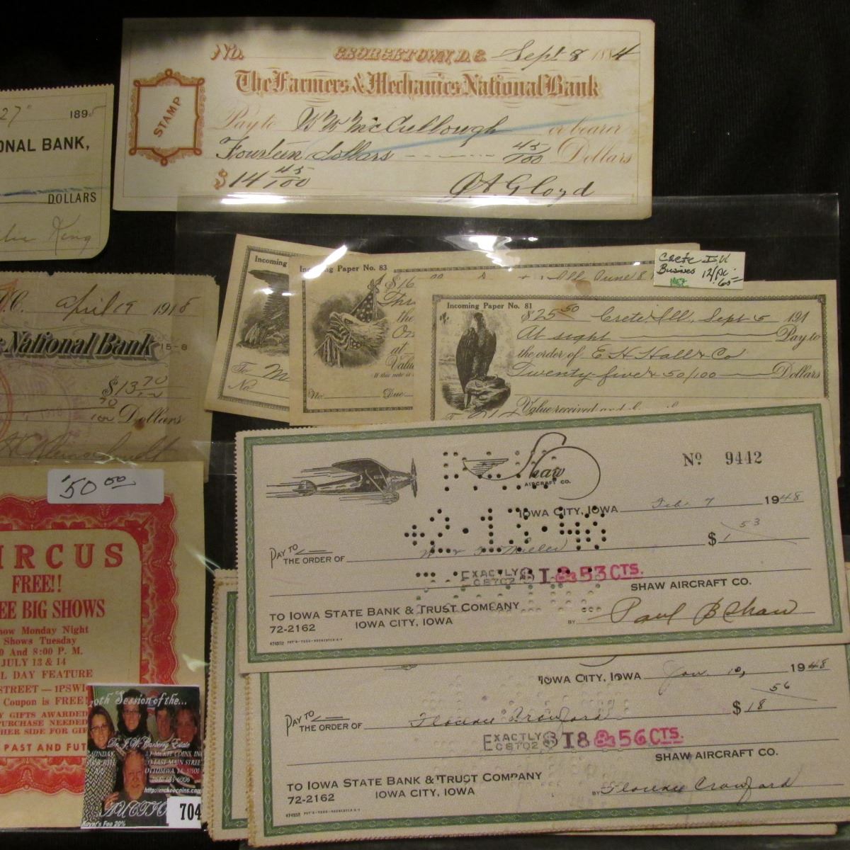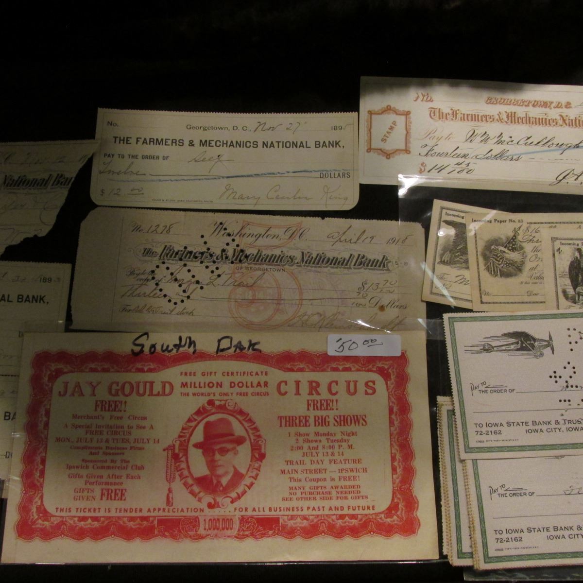 Several late 1800 or early 1900 Washington, D.C. or Georgetown, D.C. checks; several Crete, Ill. early 1900 Incoming Paper College Scrip; "Free Gift Certificate Million Dollar The World's Only Free Circus Jay Gould Circus…"; & a large group of cancelled checks from "Shaw Aircraft Co., Iowa City, Iowa".