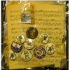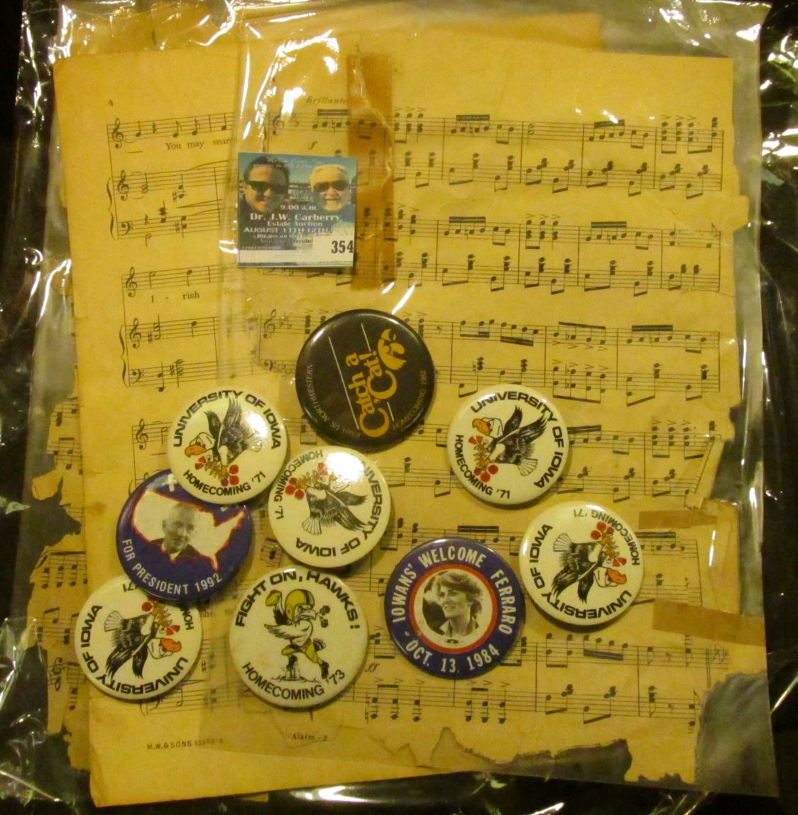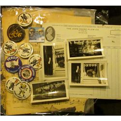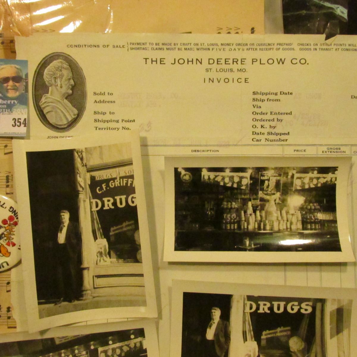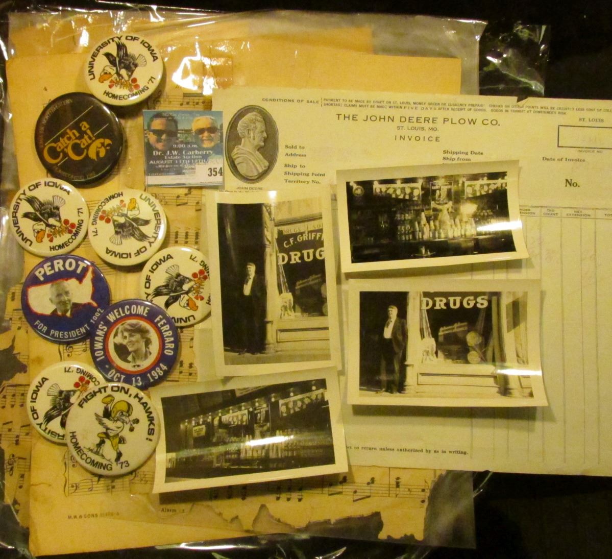 Several sheets of Music; several Hawkeye and Political Pin backs; pair of black & white photos of C.F. Griffiths drug store in Mapleton, Iowa with C.F. Griffith standing in front; & 1928 Invoice "The John Deere Plow Co. St. Louis, Mo.".