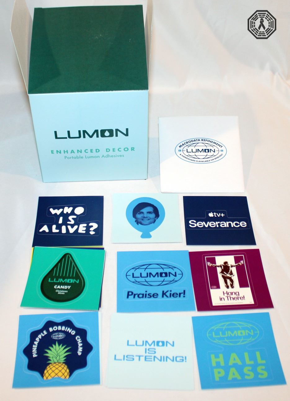 3) Enhanced Decor: Portable Lumon Adhesives (a stack of Severance stickers in a small Macrodata Refinement envelope)