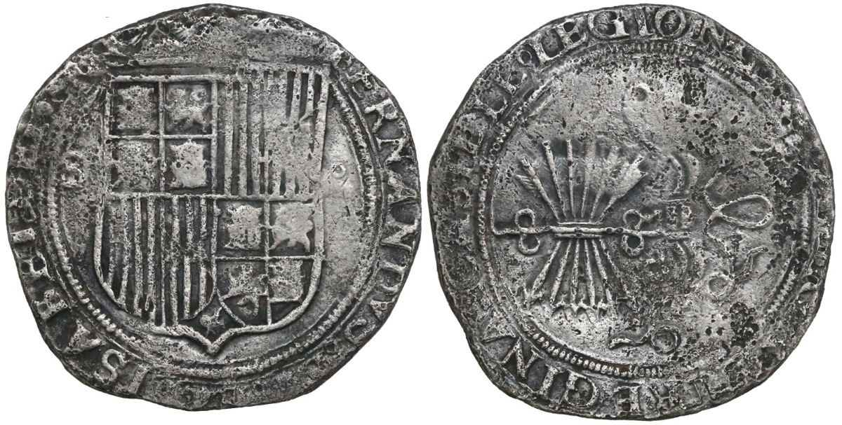 Seville, Spain, 4 reales, Ferdinand-Isabel, assayer not visible. CT-Type 188. 12.81 grams. Nice full shield and arrows, much legend despite light surface corrosion, XF details, lightly toned.