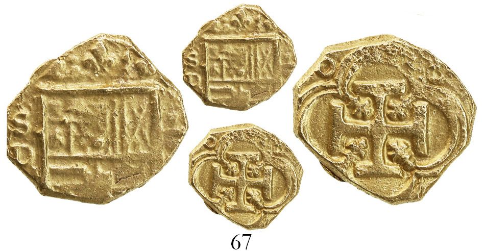 Seville, Spain, cob 2 escudos, Philip III, assayer D. CT-Type 20. 6.54 grams. Very small but thick flan (possibly lightly clipped long ago), with full S-D to left, nearly full cross, choice full cross, technically close to UNC but somewhat grainy (net XF).