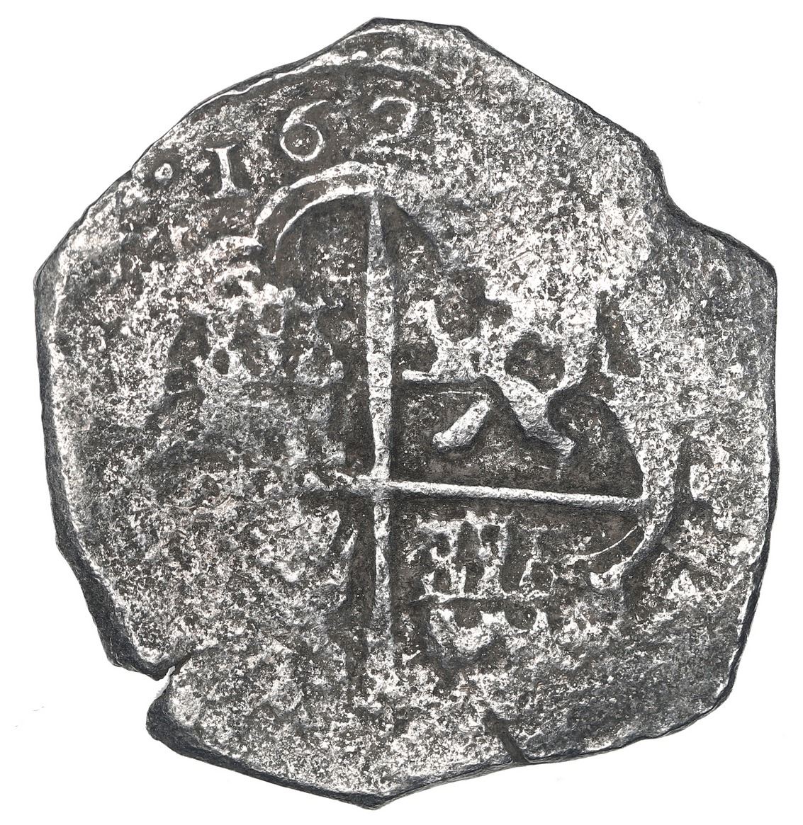 Seville, Spain, cob 4 reales, Philip III, assayer G, Grade 3. Cal-Type 292; KM-36.2. 11.66 grams. Broad flan with bold and nearly full shield and cross, bold 162 of date (last digit not visible), nicely toned, lightly surface-corroded. With Fisher/Miguel certificate 237586 (tag missing), pedigreed to our Auction 3, with original lot-tag 124. From: Atocha, sunk in 1622 west of Key West, Florida