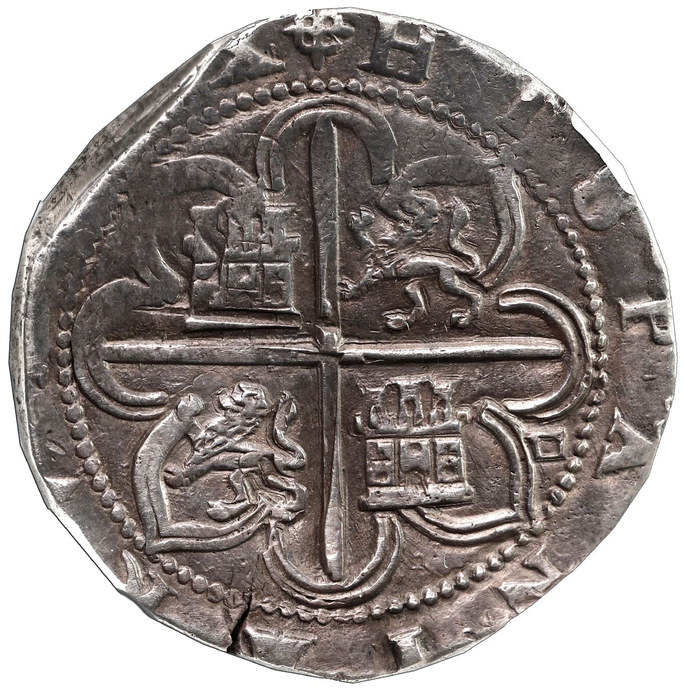 Seville, Spain, cob 8 reales, Philip II, assayer Gothic D at 4 o'clock outside tressure on reverse,