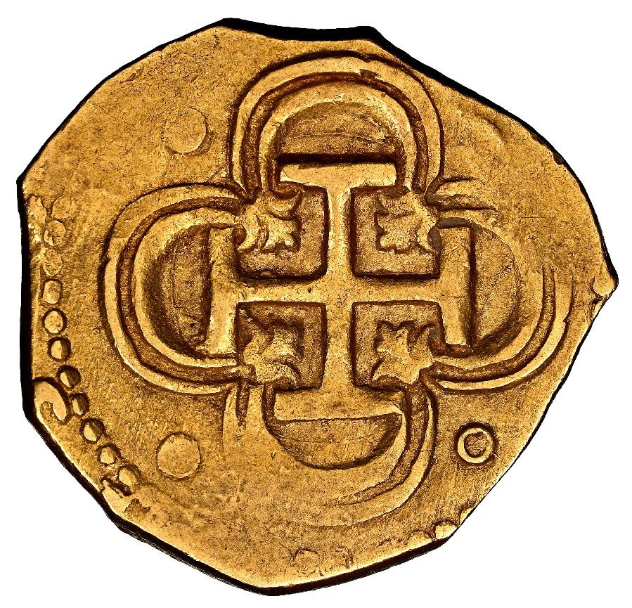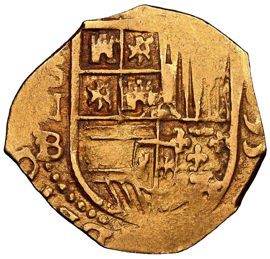 Seville, Spain, gold cob 2 escudos, 1595 date to right, assayer B below denomination II and mintmark