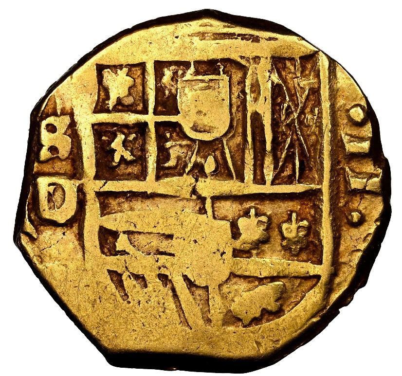 Seville, Spain, gold cob 2 escudos, 1615 D/V, very rare, NGC AU 55, finest and only example in NGC census. Cal-1072; Fr-189; KM-unl (20 for type). 6.63 grams. Bold full S-D/V to left of nearly full shield, off-center cross with full but weak and crude date (first example seen with date, albeit not attributed as such by NGC), contrasting sediment in crevices. Please use this link to verify the certification number