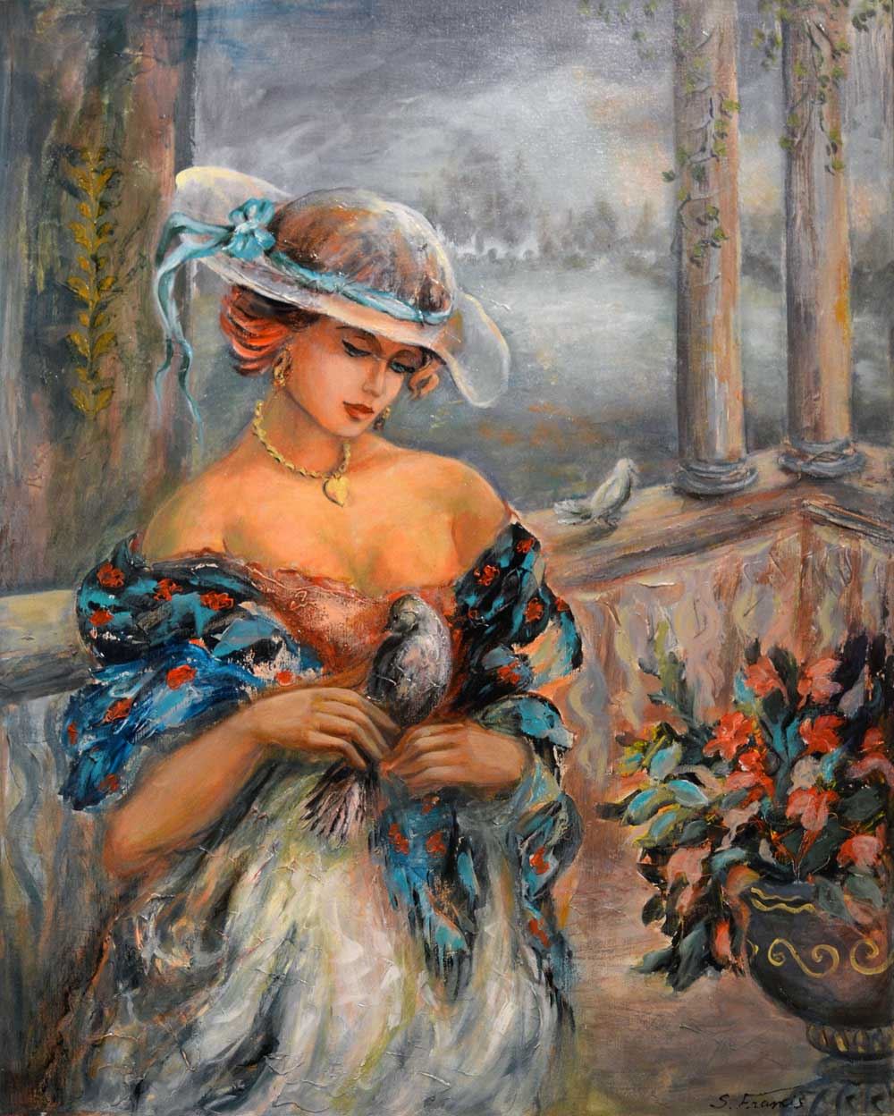 Artist: Sevitt Francis (b. 1942) - Title: Peace - Medium: Original Mixed Media on Canvas - Signature: This one-of-a-kind work is hand-signed by the artist at the bottom of the image - Image Size: Approximately 30 inches x 24 inches - Framed: Stretched and Ready for Framing - Details: This work comes with a Certificate of Authenticity - Biography: Sevitt Francis (b. 1942) is an Irish-Israeli artist and graduate of the world famous Avni Institute of Fine Arts in Tel Aviv. Her work shows a nostalgic look to gentler, kinder times. She is an expert in the use of color, and while rich, they are muted to convey a passion and sensuality that few artists can achieve. Francis' originals have sold for more than $10,000.00.