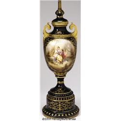 Sevres: <B>A FRENCH ARTIST SIGNED LAMP (Sevres) </B></I><BR>Sevres, c.1880<BR><BR>The cobalt blue ground with gilt decorations and a hand painted central cartouche depicting a Victorian man and woman, artist signed<BR>38in. high <BR><BR><B>Important notice:</B> Heritage usually auctions material at the rate of 200-250 lots per hour. On some occasions eBay Live bid software or the Internet may not be able to keep up with the pace of the auction. We recommend placing a realistic absentee bid now as insurance to avoid disappointment. Occasionally the auctioneer may eliminate or reject an eBay Live bid, and the auctioneer may also reopen a lot after the close of the eBay live bidding (usually because we missed an audience bid), and may reject your bid even if it shows you as the winning bidder. By bidding via eBay Live, you agree that Heritage may award the lot to another bidder at its sole discretion under the circumstances described above or any other reasonable circumstances. Since eBay bids are not shown to us until we open the lot on the floor, we treat those bids just like floor bids. In most cases the floor responds before the eBay bid is presented to us, due to Internet lag time, so for consistency we have made it a policy that floor bids are always considered first over tie eBay live bids. Also please note that all Heritage lots purchased through eBay Live carry a 24.5% Buyer's Premium. Please make sure you read the Terms and Conditions before you bid.