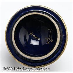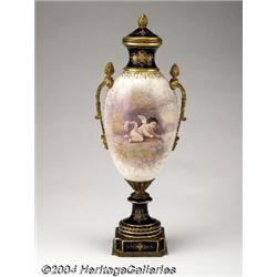 Sevres: <B>A PORCELAIN AND ORMOLU URN (Sevres) </B></I><BR>Sevres, c.1890<BR><BR>The cobalt blue base with intricate gilt design supporting a bulbous porcelain vase and two bronze handles, the wooded lake scene depicting a maiden in flowing gown sitting on a bench with a cherub, reverse side depicting a cherub writing in a forest, cobalt blue rim and covered lid, artist signed <I>Lucot</B></I> in design, also signed with <I>Sevres</B></I> mark under glaze in lid<BR>18in. high <BR><BR><B>Important notice:</B> Heritage usually auctions material at the rate of 200-250 lots per hour. On some occasions eBay Live bid software or the Internet may not be able to keep up with the pace of the auction. We recommend placing a realistic absentee bid now as insurance to avoid disappointment. Occasionally the auctioneer may eliminate or reject an eBay Live bid, and the auctioneer may also reopen a lot after the close of the eBay live bidding (usually because we missed an audience bid), and may reject your bid even if it shows you as the winning bidder. By bidding via eBay Live, you agree that Heritage may award the lot to another bidder at its sole discretion under the circumstances described above or any other reasonable circumstances. Since eBay bids are not shown to us until we open the lot on the floor, we treat those bids just like floor bids. In most cases the floor responds before the eBay bid is presented to us, due to Internet lag time, so for consistency we have made it a policy that floor bids are always considered first over tie eBay live bids. Also please note that all Heritage lots purchased through eBay Live carry a 24.5% Buyer's Premium. Please make sure you read the Terms and Conditions before you bid.