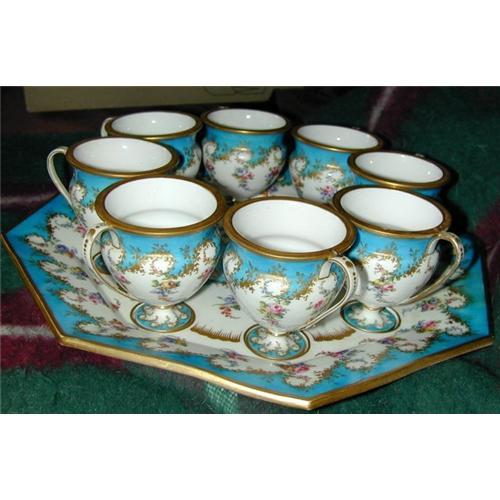 We offer a French Sevres hot chocolate ensemble made in 1765 bearing the mark of the decorator "Courtice" (Reference:Chaffers' Handbook of Pottery and Porcelain). The set consists of 8 cups, each of which measures 3 inches high (7.5 cm) and across the tops measure 2.5 inches across (6.5 cm). Each cup sits in a fitted Sevres porcelain tray. All pieces are marked with the Sevres crossed Ls with the date letter M, and each piece bears the sign for the modeller or decorator, Courtice.