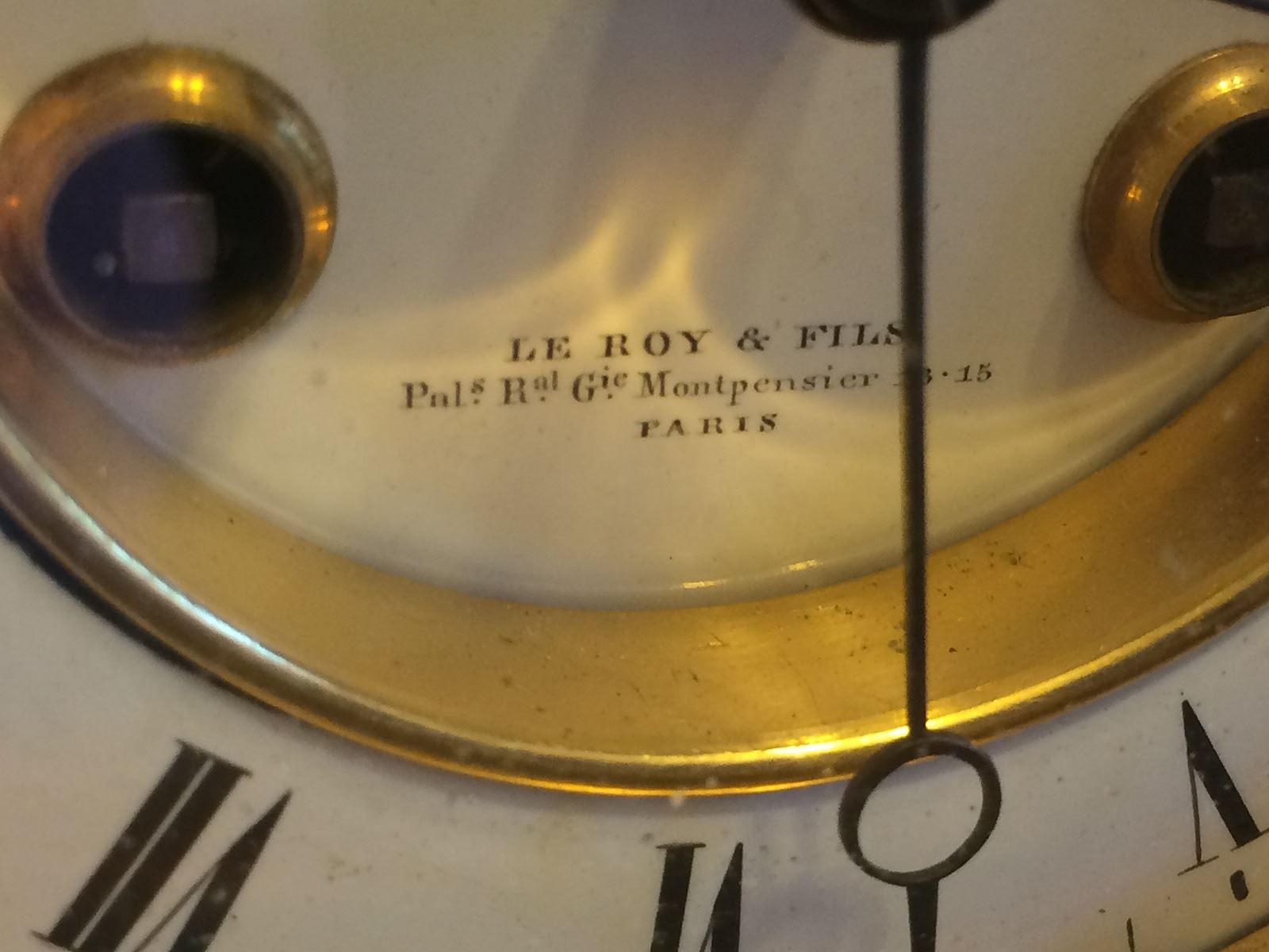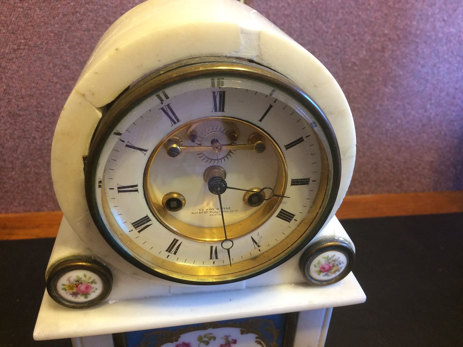 French Sevres Clock, very rare style to find Sevres in marble. Very fine clock movement, very precise, signed on dial by the maker. Painted panel on clock is beautiful floral design. Signed on dial Le Roy & Fils, Paris.