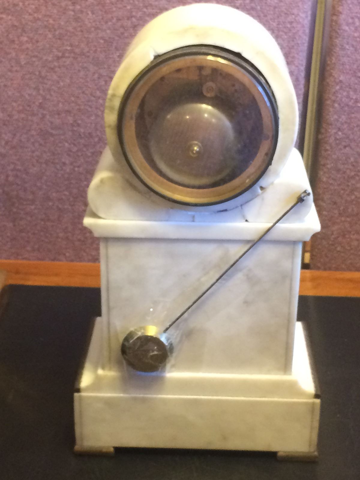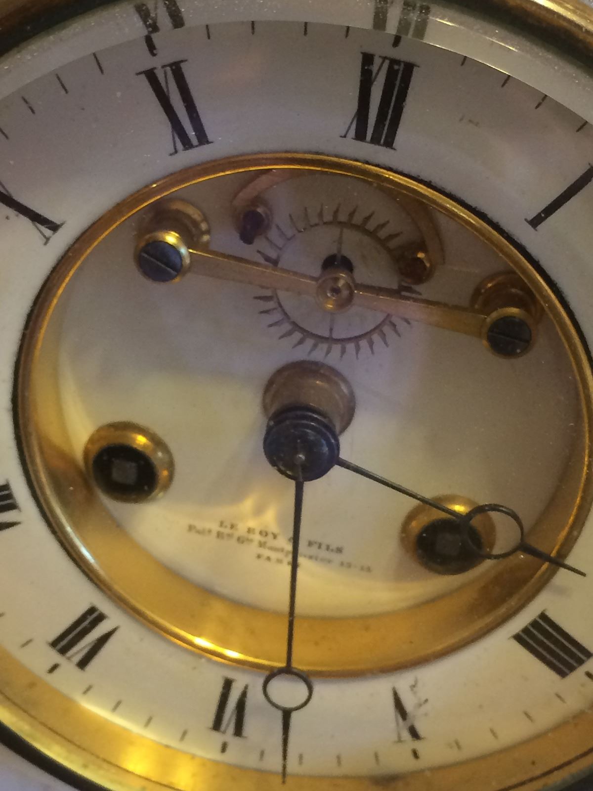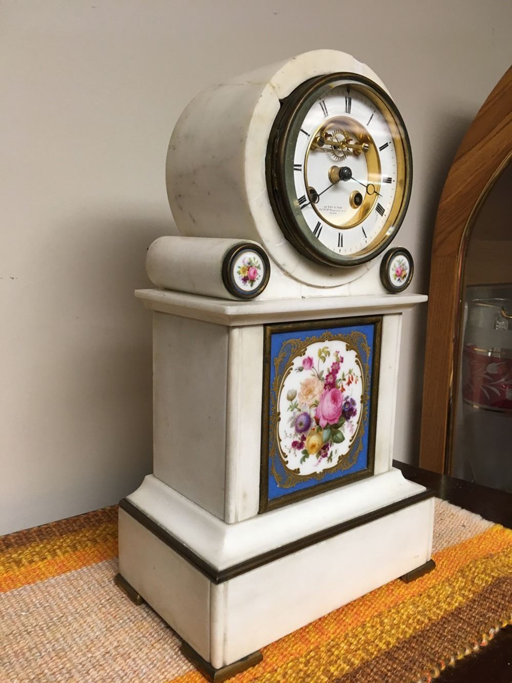 French Sevres Clock, very rare style to find Sevres in marble. Very fine clock movement, very precise, signed on dial by the maker. Painted panel on clock is beautiful floral design. Signed on dial Le Roy & Fils, Paris.