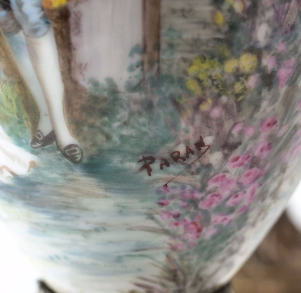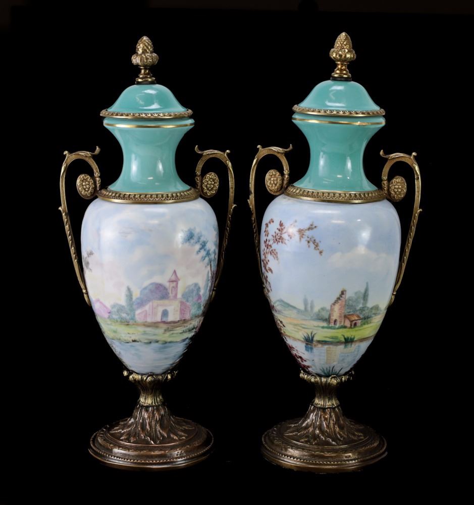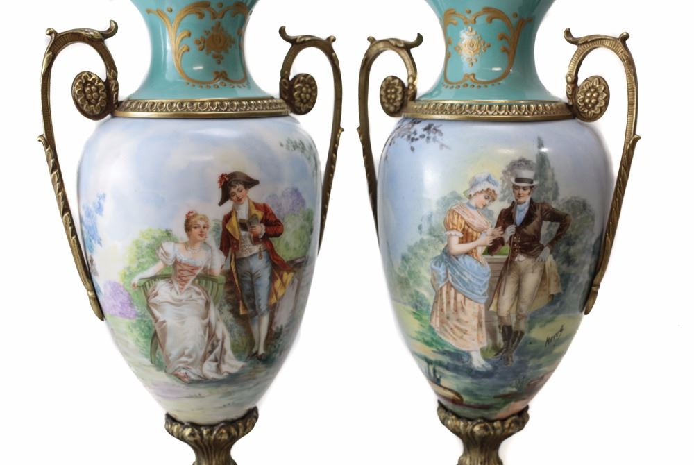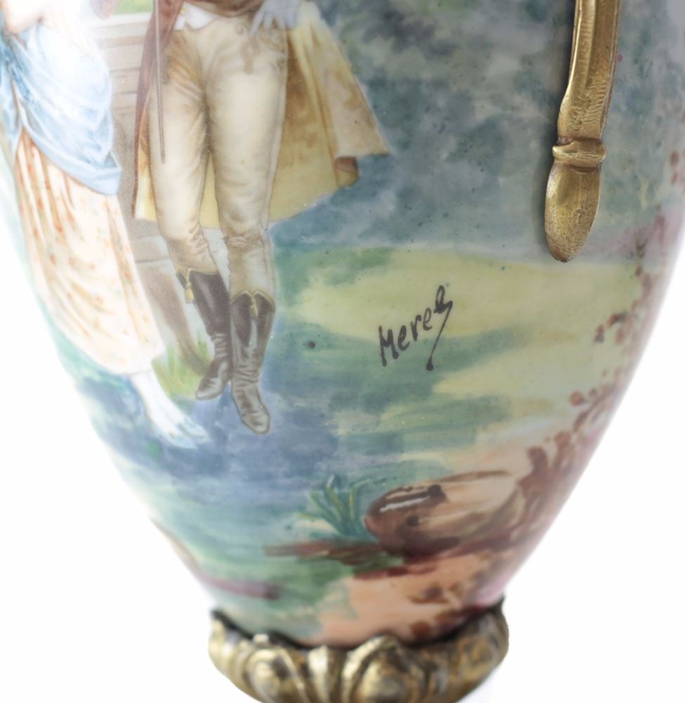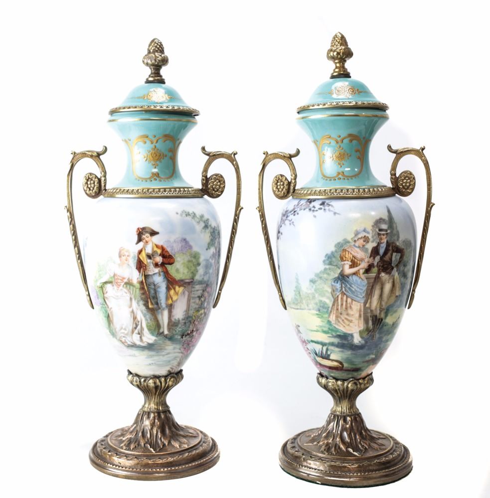 A pair of Sevres style lidded porcelain urns. Mounted with gilt bronze or metal with finial acorn. Features a courting scene of a man and woman. Artist signed Meres.
