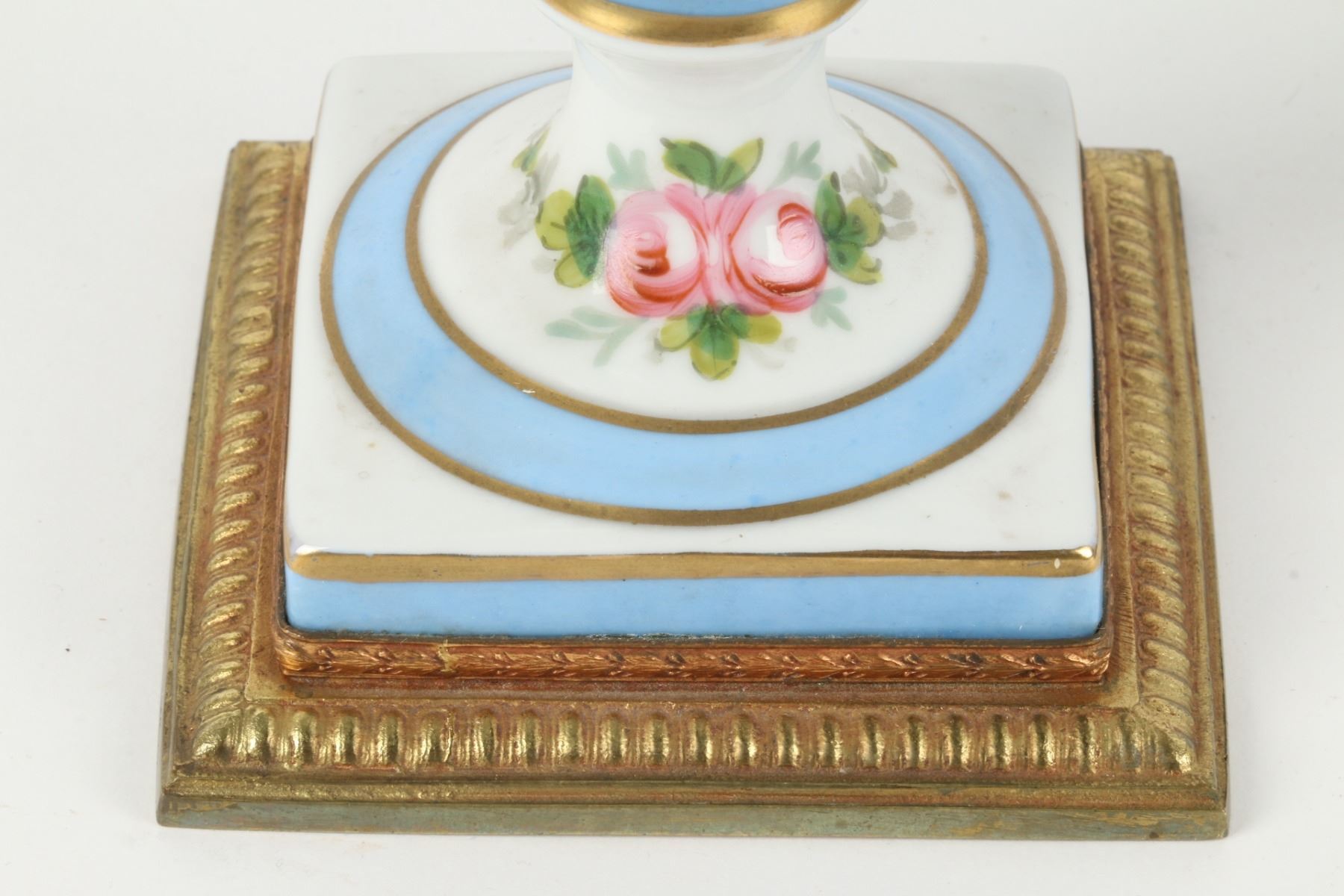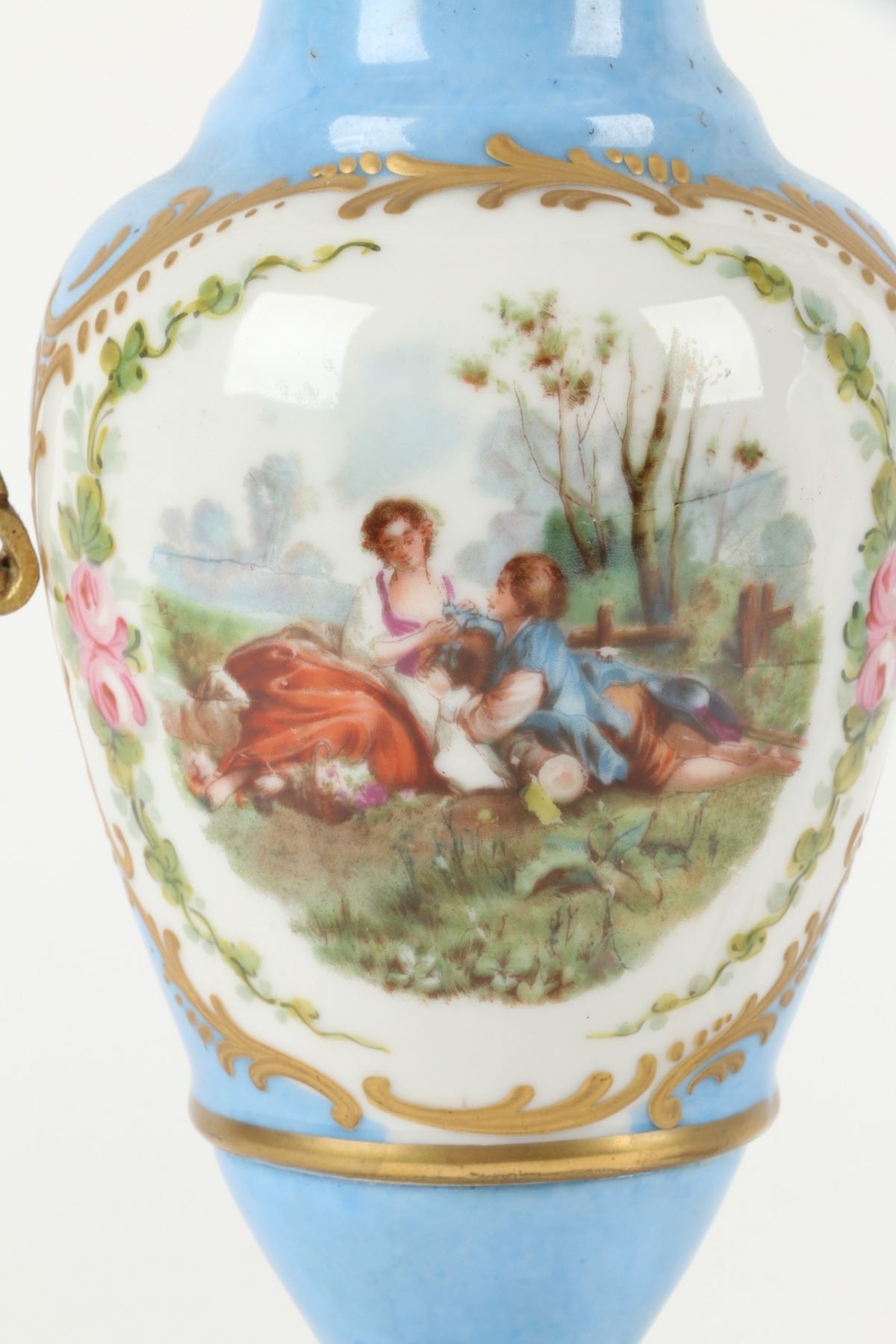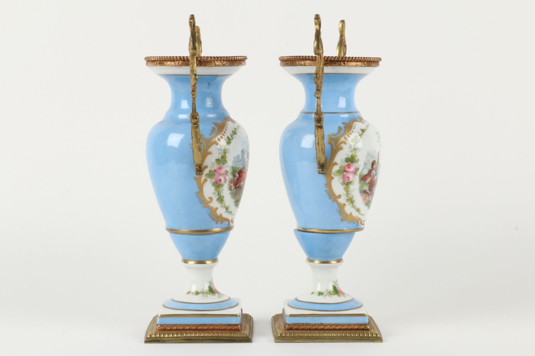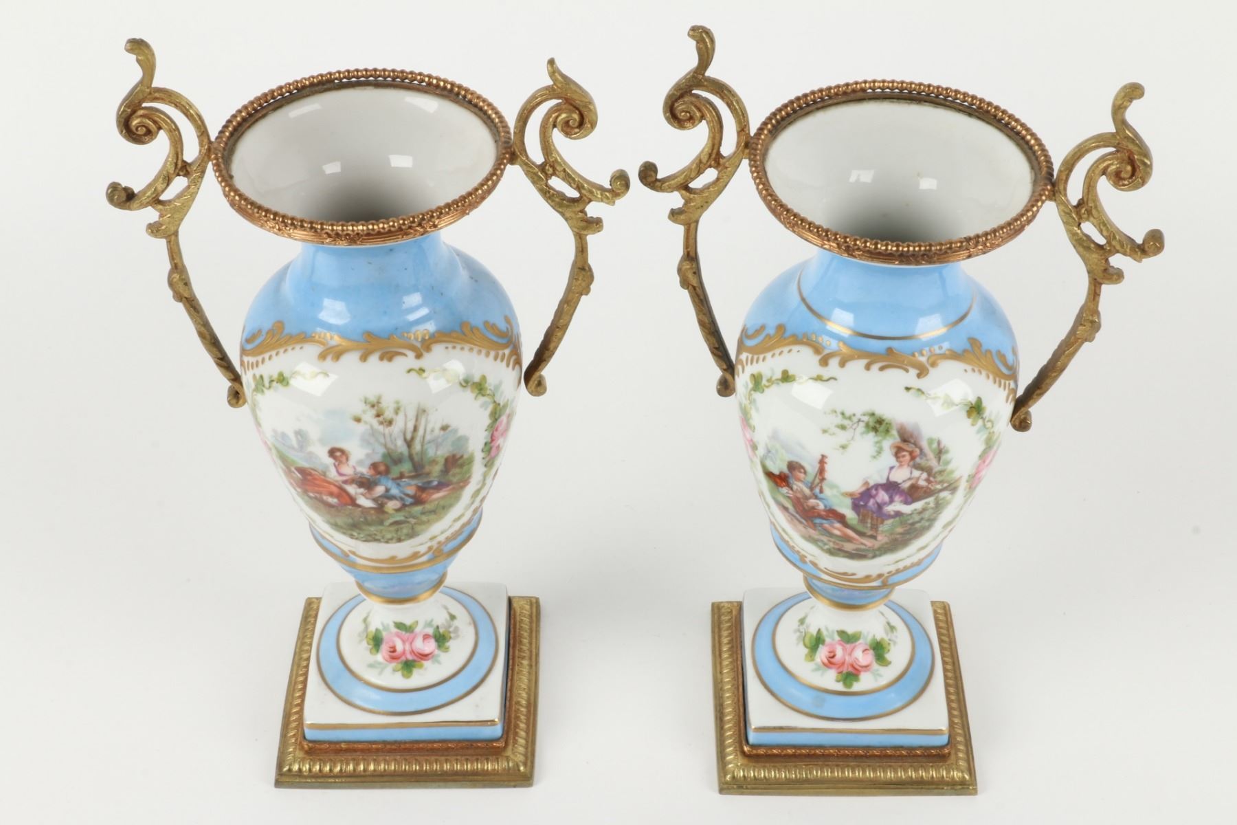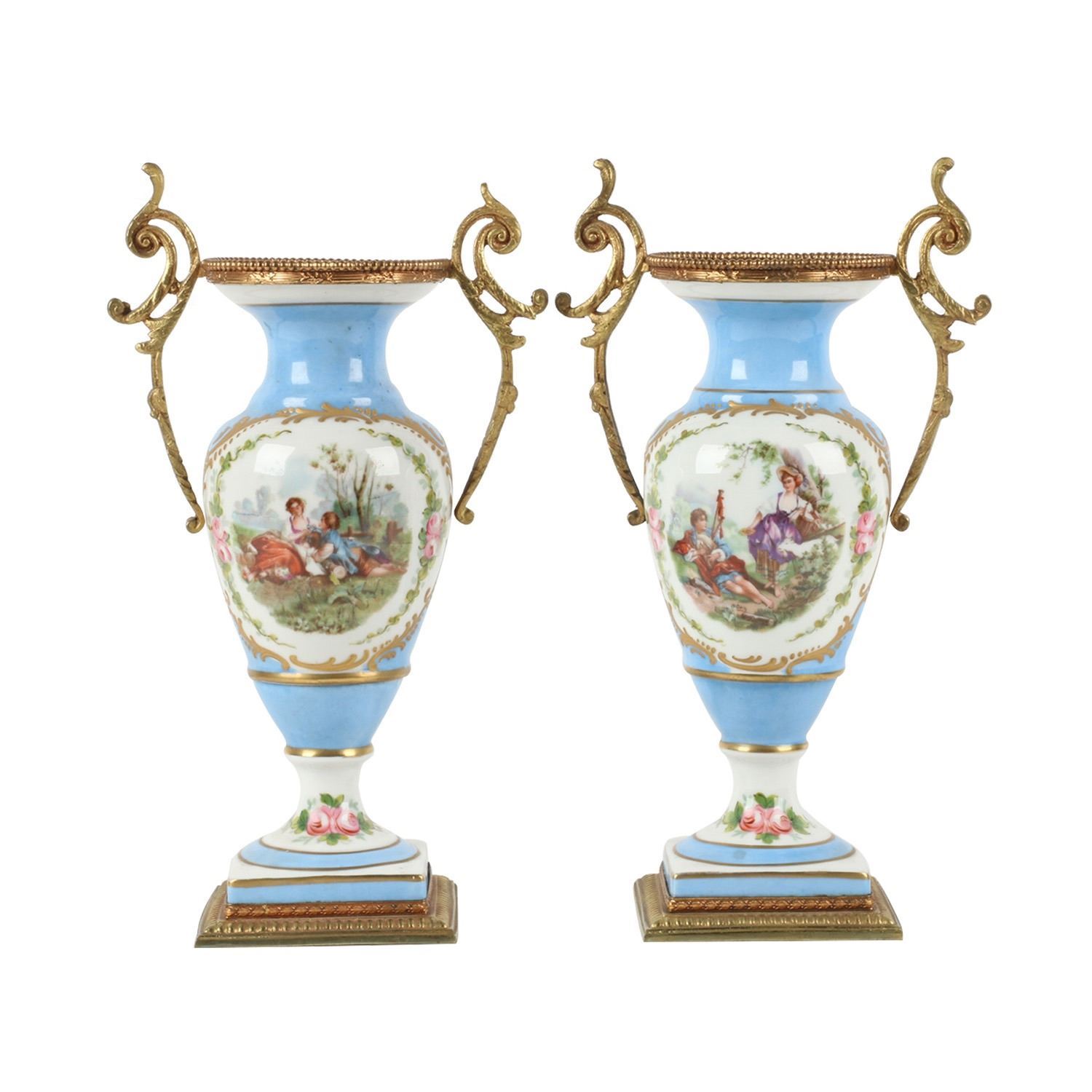 Lot 437 - Pair (2). French. Transfer serenade scene with gilt border. Cast brass mounts. Marked "Birks Hand-painted Made in France" with underglaze blue mark. 11" h. $200-300.