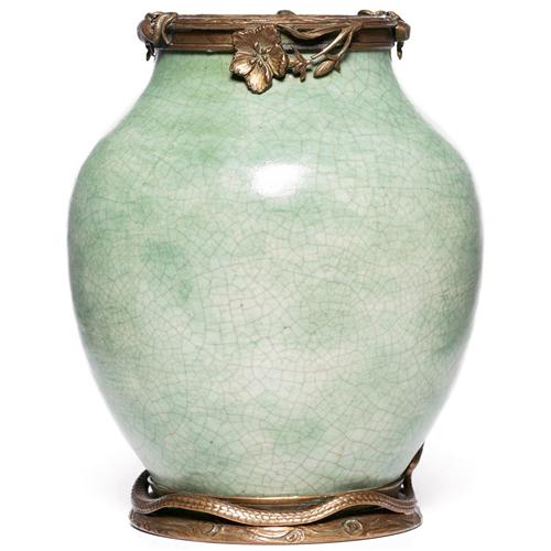 Fine Sevres vase, attribution, bulbous form in green with metal foot and rim with snake and lizards, unmarked,5in.h, exceptional metal applications