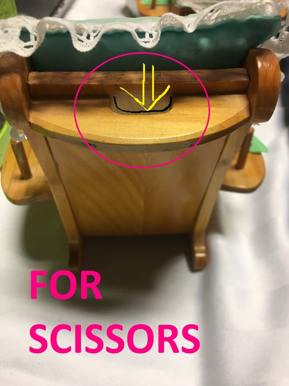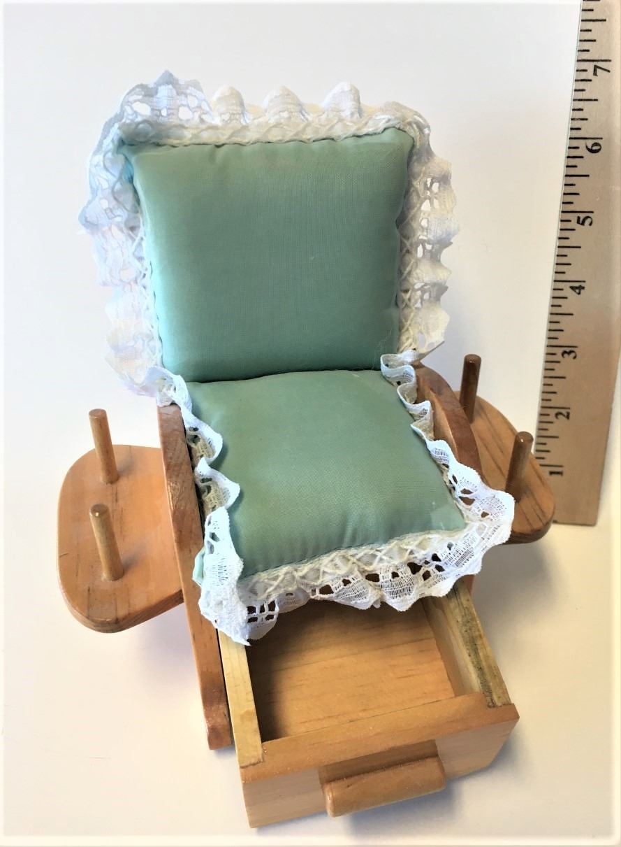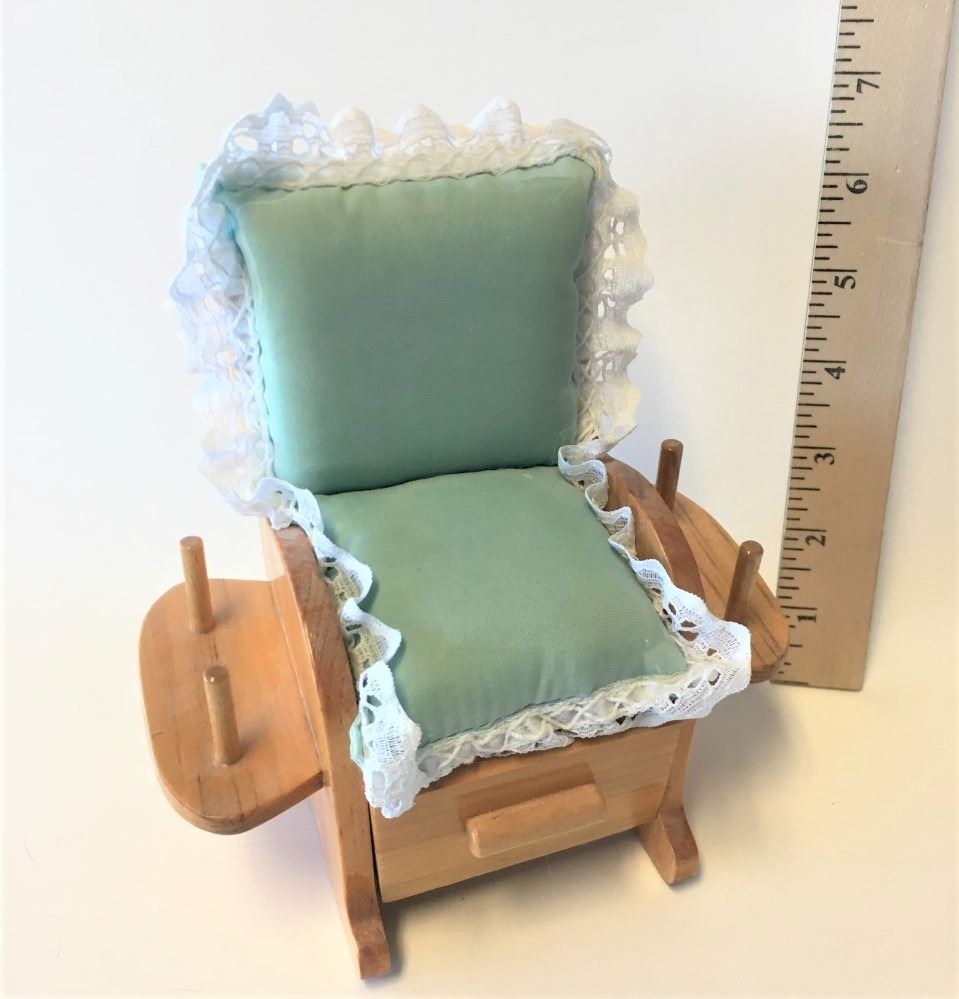 Custom Made, put spool of thread on the arms, keep items in the drawer, use the seat as a pin cushion. There is a space for scissors on the back