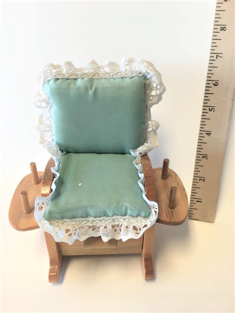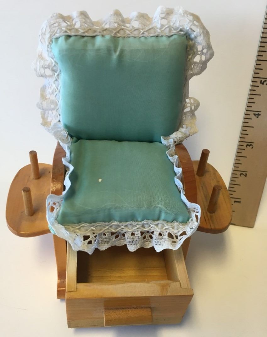 Custom Made, put spool of thread on the arms, keep items in the drawer, use the seat as a pin cushion. There is a space for scissors on the back.