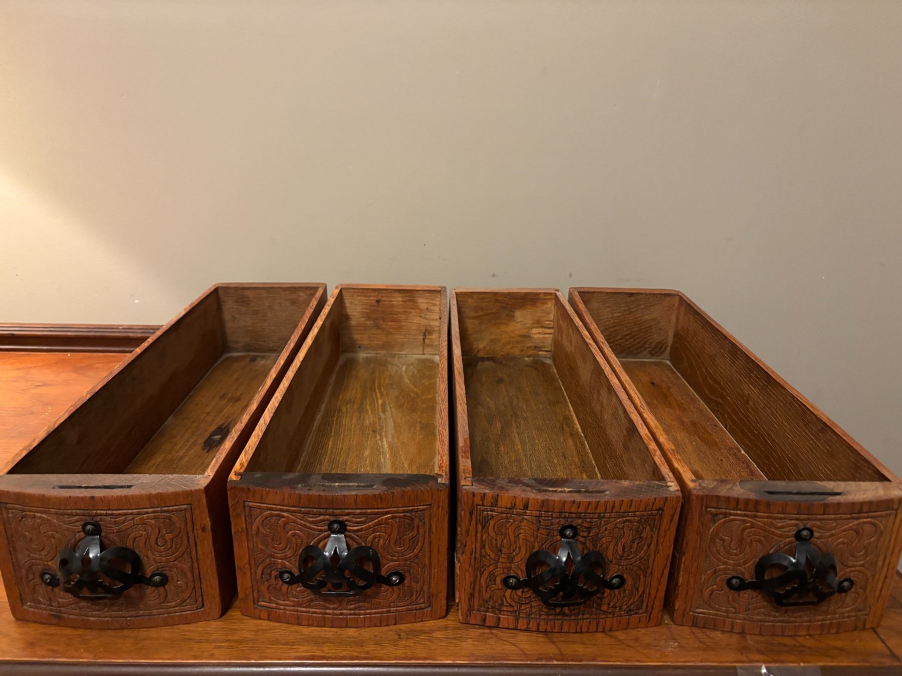 Four wooden sewing machine drawers. Often used for decorative purposes- painted and used for storage in everyday living spaces. Drawers are 5” wide x 17 ¼” long