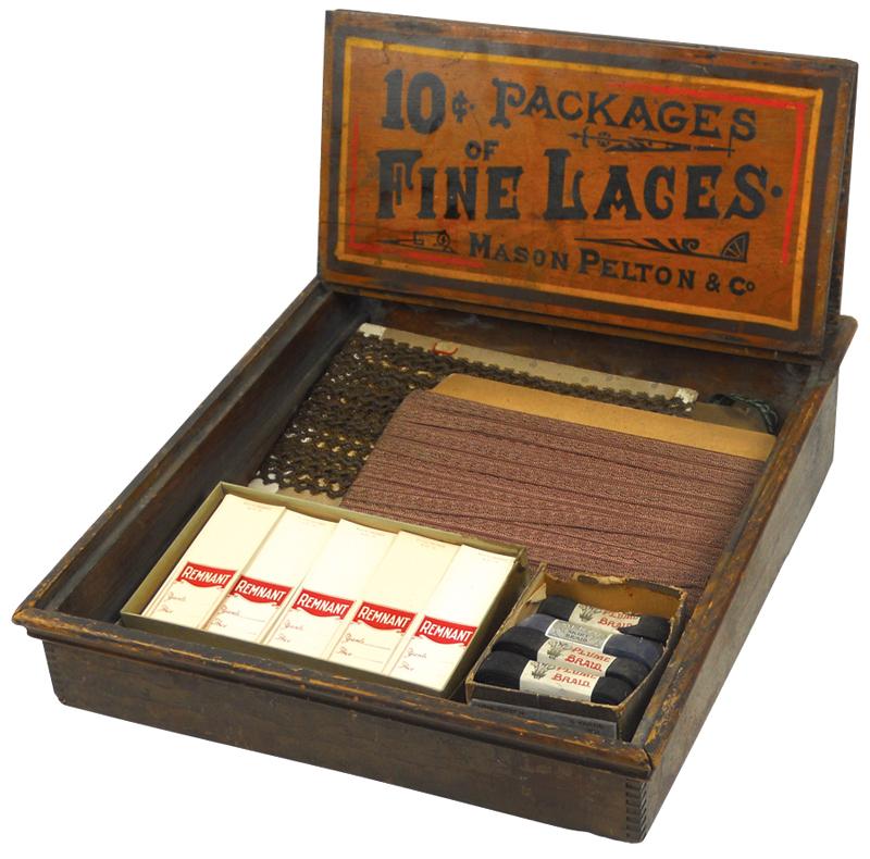 Sewing items; includes Lace cabinet from Mason Pelton & Co, slanted wood case w/adv lid, comes w/several cards of early 1900's bindings, trims, braid & full box of old remnant cards, all VG/Exc cond, case as shown is 14"H x 18"W x 20"D.