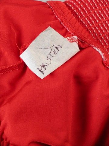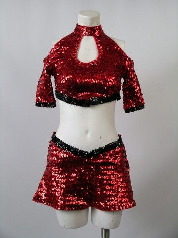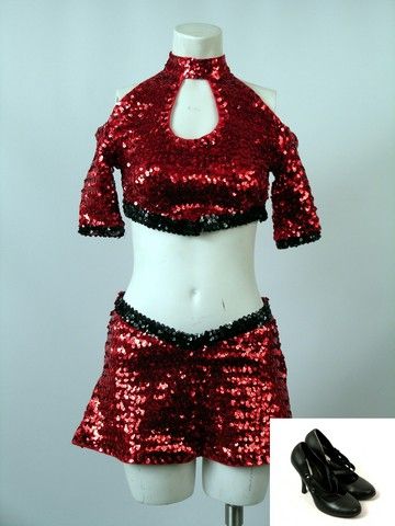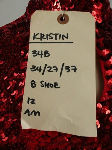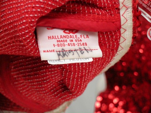 What is a road trip with a group of horny High School Seniors without a Fairground Show called "Abstinence" for them to run into? That is exactly what happens in "Sex Drive" (2008). This is Main Dancer's (Kristin Liu) screen worn hero dance number costume for that show. It is a red sequin with black sequin border halter top with choker collar and half sleeves with open shoulders. Red sequin skirt with black sequin border. Both have "Kristen" written on the tag. And pair of black heels with two straps across foot. Wardrobe tag included.