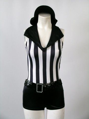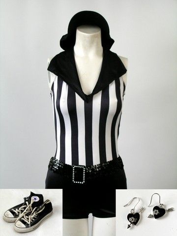 In "Sex Drive" a group of sex-starved high school seniors (is there any other kind?), find themselves at a county fair, watching a special show called "Abstinence". The main Dancer (Kristin Liu) steals the show (especially with her many costumes). This is her screen worn hero referee costume. Black and white one piece spandex costume with black sequin belt, "Converse" black and white sneakers, a black baseball cap, and a pair of black heart earrings with silver arrow and flower.