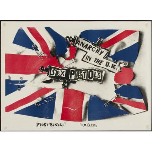 <B>Sex Pistols "Anarchy in the UK" Promotional Poster.</B></I> This poster was released to advertise Sex Pistols first single on EMI. Poster measures 38.5" x 27.75" and is in VG- condition (stains to each corner).<BR><BR><b>Shipping:</b> Flat Material, Large (<a target="_blank" href="http://www.heritageauctions.com/common/shipping.php">view shipping information</a>)