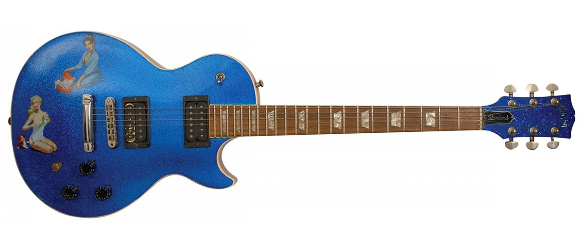 Jones’s personally owned and used blue glitter-bodied Gibson Les Paul electric guitar used on stage during the Sex Pistols reunion. This guitar was used by Jones in every show on the Sex Pistols’ 1996 Filthy Lucre tour. The body of the guitar is adorned with two affixed pin-up girl stickers. This guitar was designed by Jones with the electronics fixed to replicate the amazing sound heard on the first Sex Pistols record. In fine condition, with expected light wear and chipping to finish. The Filthy Lucre Tour in 1996 consisted of 78 shows in five continents spanning almost six months. This guitar was originally acquired directly from Jones in 1998. Stage-used gear from this iconic punk band is virtually non-existant and for certain the demand far outweighs the supply.