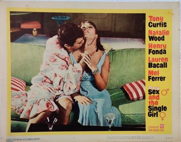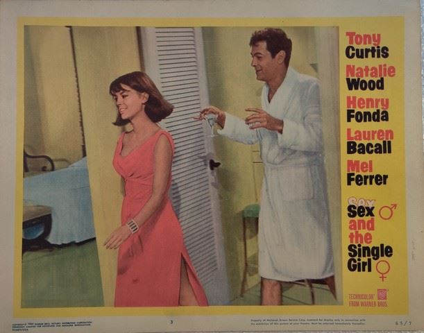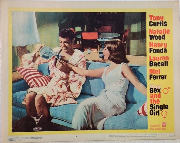 Sex and the Single Girl (Warner Bros., 1964) lobby card. Romance, Comedy. Starring Tony Curtis, Natalie Wood, Henry Fonda, Lauren Bacall, Mel Ferrer, Frank Jeffries, Leslie Parrish, Edward Everett Horton, Otto Kruger, Stubby Kaye, Howard St. John, Barbara Bouchet. Directed by Richard Quine. Very minor edge wear, minor creases, very minor stains. Excellent. (11"x14").