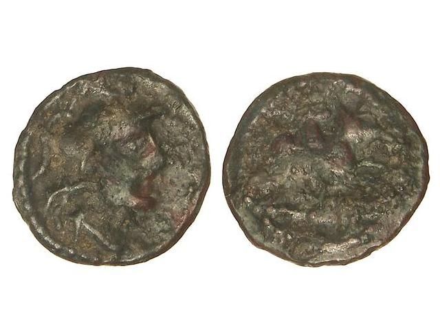 Sextante. EMPORITON-EMPORIA. Anv.: Cabeza de Palas a derecha. Rev.: Pegaso a derecha, debajo (___). 1,28 grs. (Pequeñas oxidaciones en reverso). MBC-/BC.
