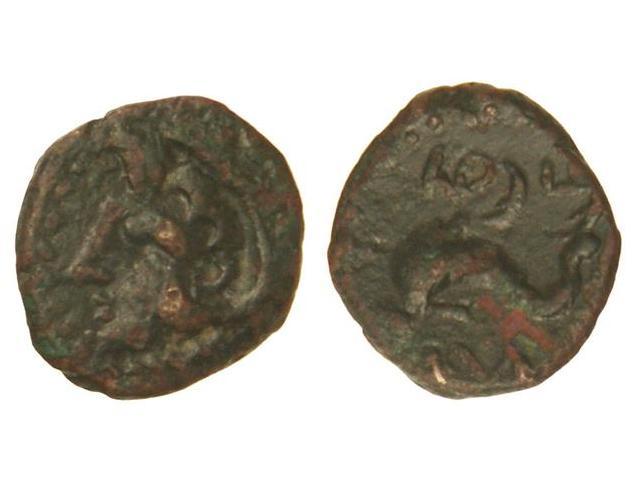 Sextante. - GADES. - Anv.: Cabeza de Hércules con piel de león a izquierda. Rev.: Delfín a izquierda, leyenda arriba y debajo. 1,60 grs. Pátina oscura. AB-1357; Vill-47 sim. (MBC/MBC+). - -
