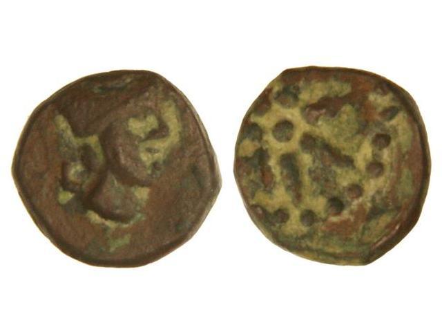 Sextante. MALACA. Anv.: Cabeza con gorro egipcio a derecha. Rev.: Estrella de siete rayos. 2,80 grs. Cuño de gran arte. Pátina marrón. AB-1722 var.; G.G.-96 sim. (MBC+).
