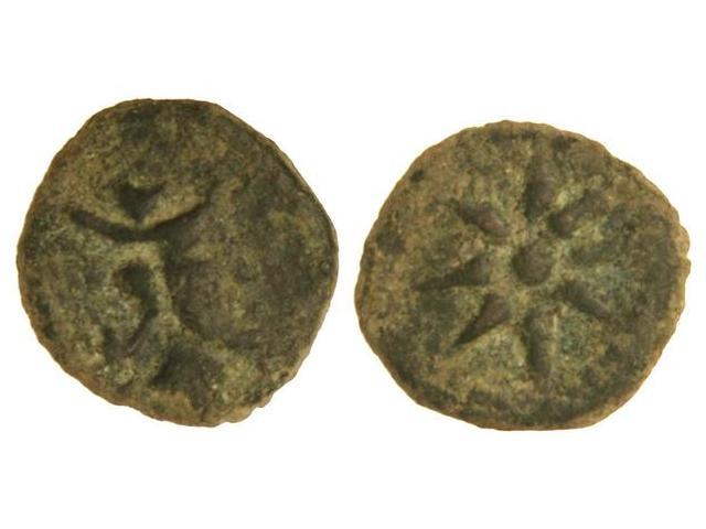 Sextante. MALACA. Anv.: Cabeza con gorro egipcio y coleta a derecha. Rev.: Estrella de ocho rayos. 2,50 grs. Pátina verde oscuro. AB-1725; G.G.-92. MBC.