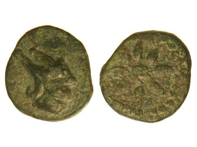 Sextante. MALACA. Anv.: Cabeza con gorro egipcio y coleta a derecha. Rev.: Estrella de ocho rayos. 2,30 grs. Variante por diferente forma del gorro. Pátina verde. AB-1725 var.; G.G.-93. MBC+/MBC-.