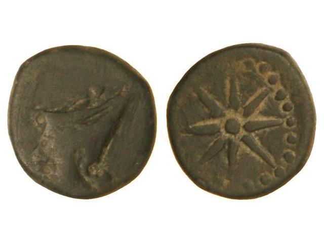Sextante. MALACA. Anv.: Cabeza con gorro egipcio y coleta a izquierda. Rev.: Estrella de ocho puntas. 2,30 grs. Variante de gorro egipcio G.G.-No cat. Pátina verde oscura. AB-1723 var.; G.G.-105 var. MBC+/EBC.