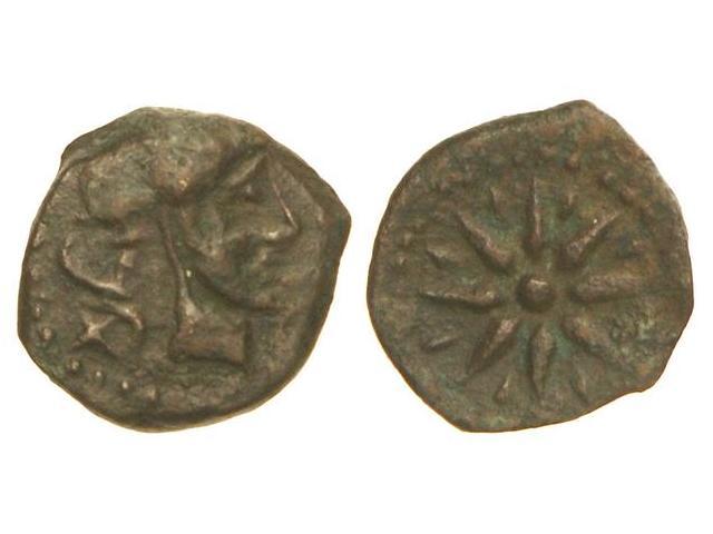 Sextante. MALACA. Anv.: Cabeza con gorro puntiagudo a derecha, detrás leyenda neopúnica. Rev.: Estrella de dieciséis rayos. 2,20 grs. Variante de anteriores por estilo de leyenda. Pátina oscura. AB-1744 var.; G.G.-87. MBC+.