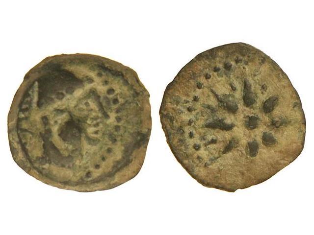 Sextante. MALACA. Anv.: Cabeza con gorro puntiagudo fileteado con puntos a derecha, detrás leyenda neopúnica. Rev.: Estrella de dieciséis rayos. 2,10 grs. Variante del G.G.-83 por cabeza de mayor tamaño. Pátina verde oscura. AB-1744 var.; G.