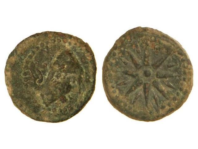 Sextante. MALACA. Anv.: Cabeza de Vulcano a derecha, con gorro en punta fileteado de puntos, detrás leyenda neopúnica. Rev.: Estrella de dieciséis rayos. 2,10 grs. Variante de G.G.-83 por gorro menos puntiagudo y variante de leyenda. Pátina