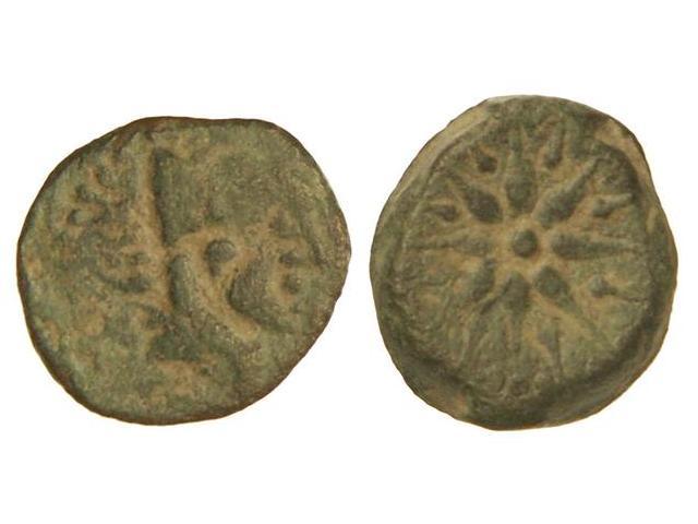 Sextante. MALACA. Anv.: Cabeza de Vulcano a derecha con gorro puntiagudo fileteado de puntos, detrás leyenda neopúnica. Rev.: Estrella de dieciséis rayos. 2,80 grs. Pátina verde. AB-1744; G.G.-83. MBC+.