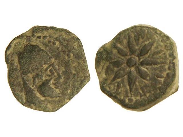 Sextante. MALACA. Anv.: Cabeza de Vulcano con casco voluminoso redondeado a derecha, detrás (leyenda neopúnica). Rev.: Estrella de dieciséis rayos. 2,40 grs. Variante por tamaño del casco y leyenda más pequeña. Pátina verde. AB-1744 var.; G.